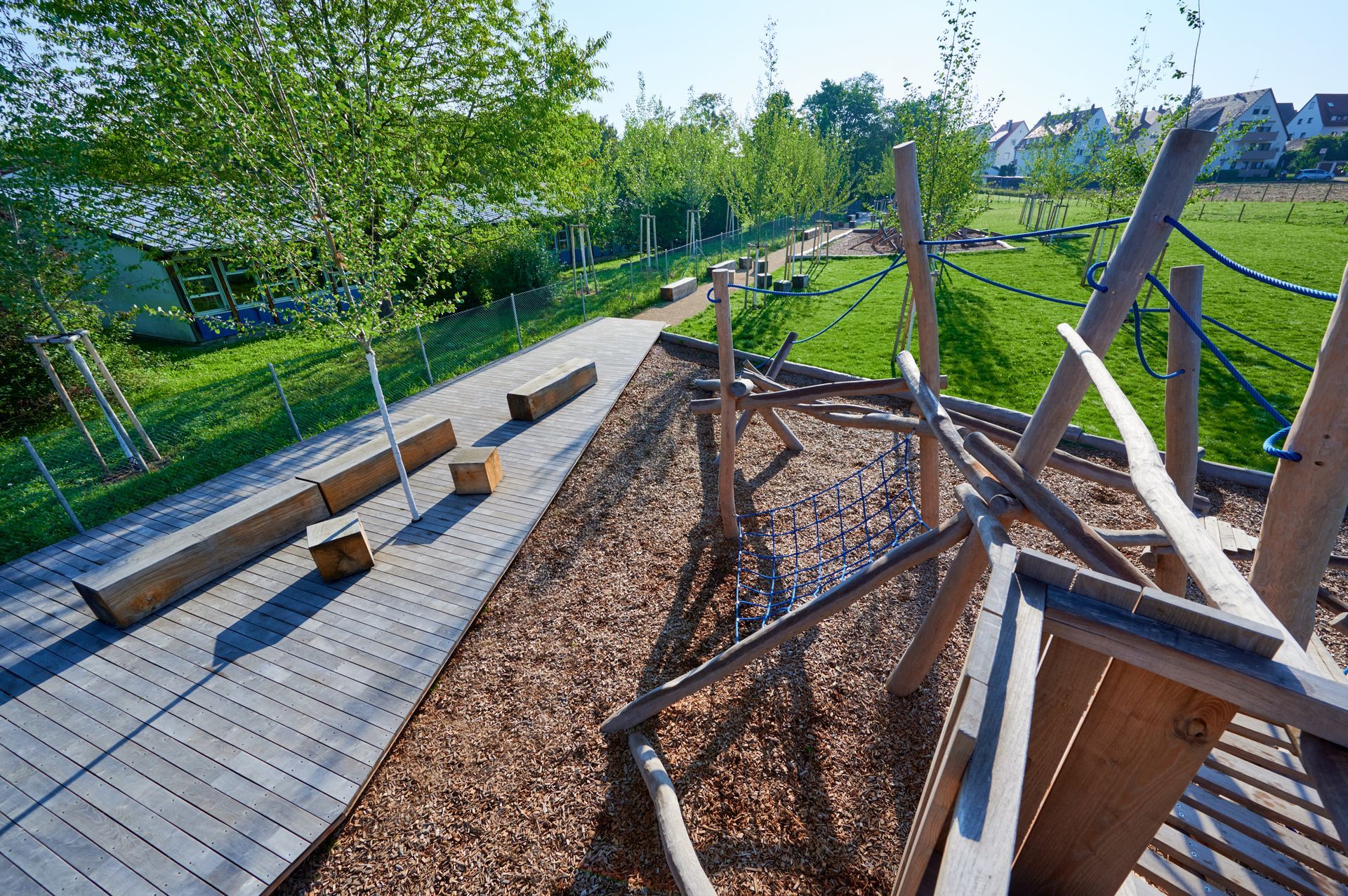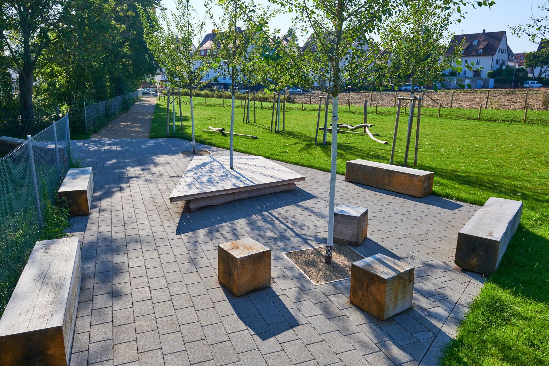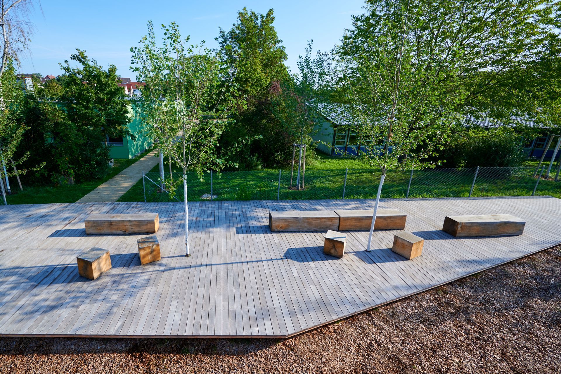 Auf einer angrenzenden Ackerfläche entstand während des Schulumbaus ein naturnaher Interimspausenhof. Mit einfachen, vollständig rückbaubaren Materialien, Spielflächen, Sitzstämmen und Blühwiesen bietet er Schüler:innen vielfältige Möglichkeiten zum Spielen und Verweilen und kann nach der Nutzungszeit kostengünstig zurückgebaut werden.