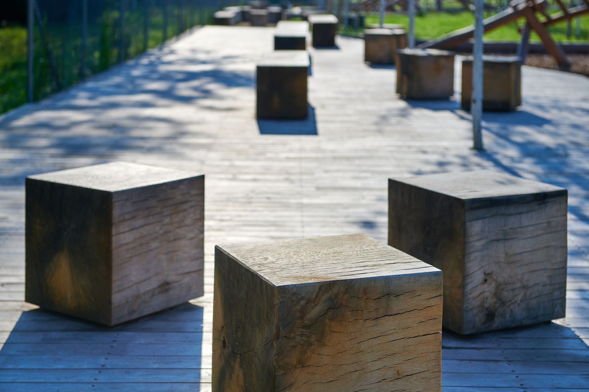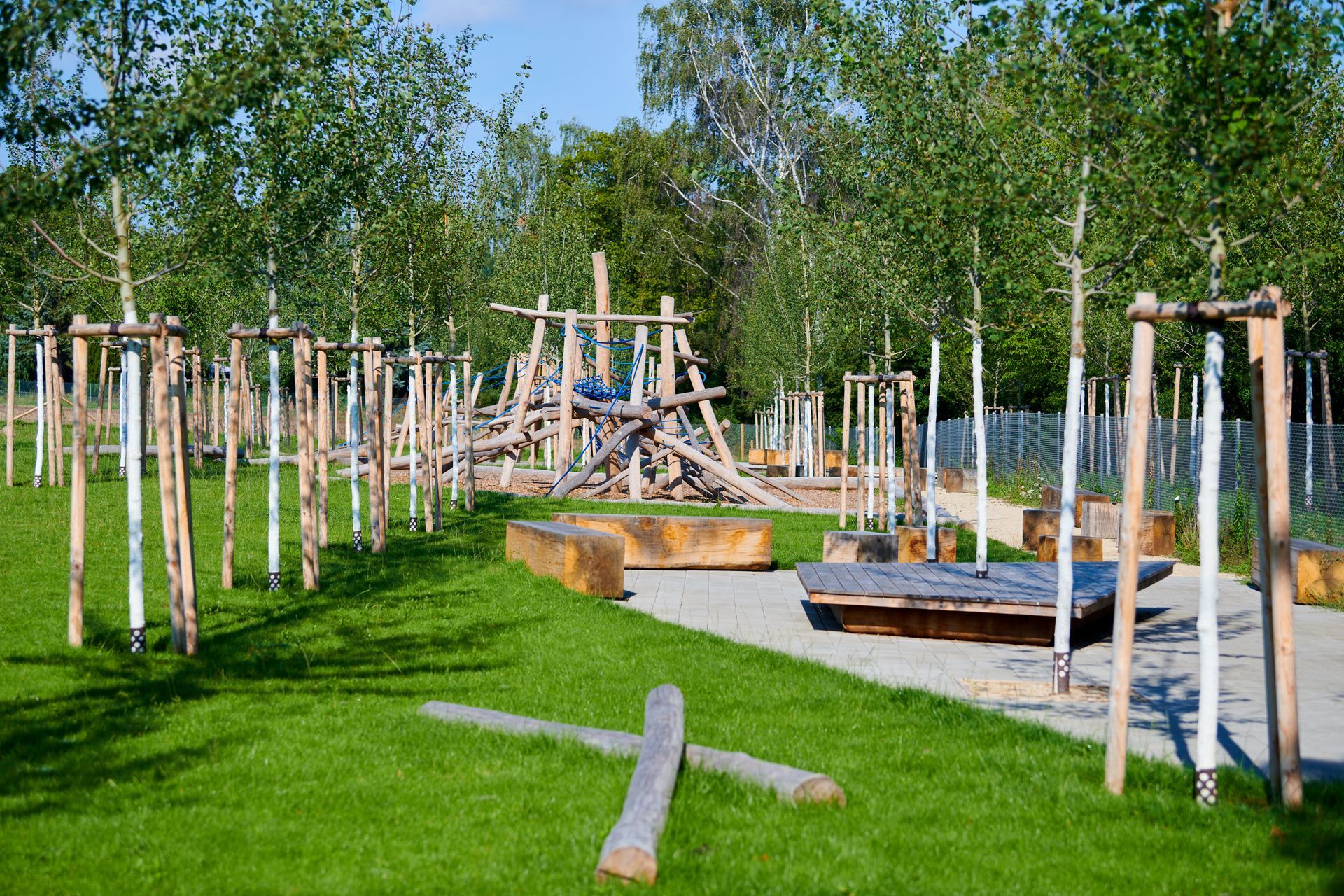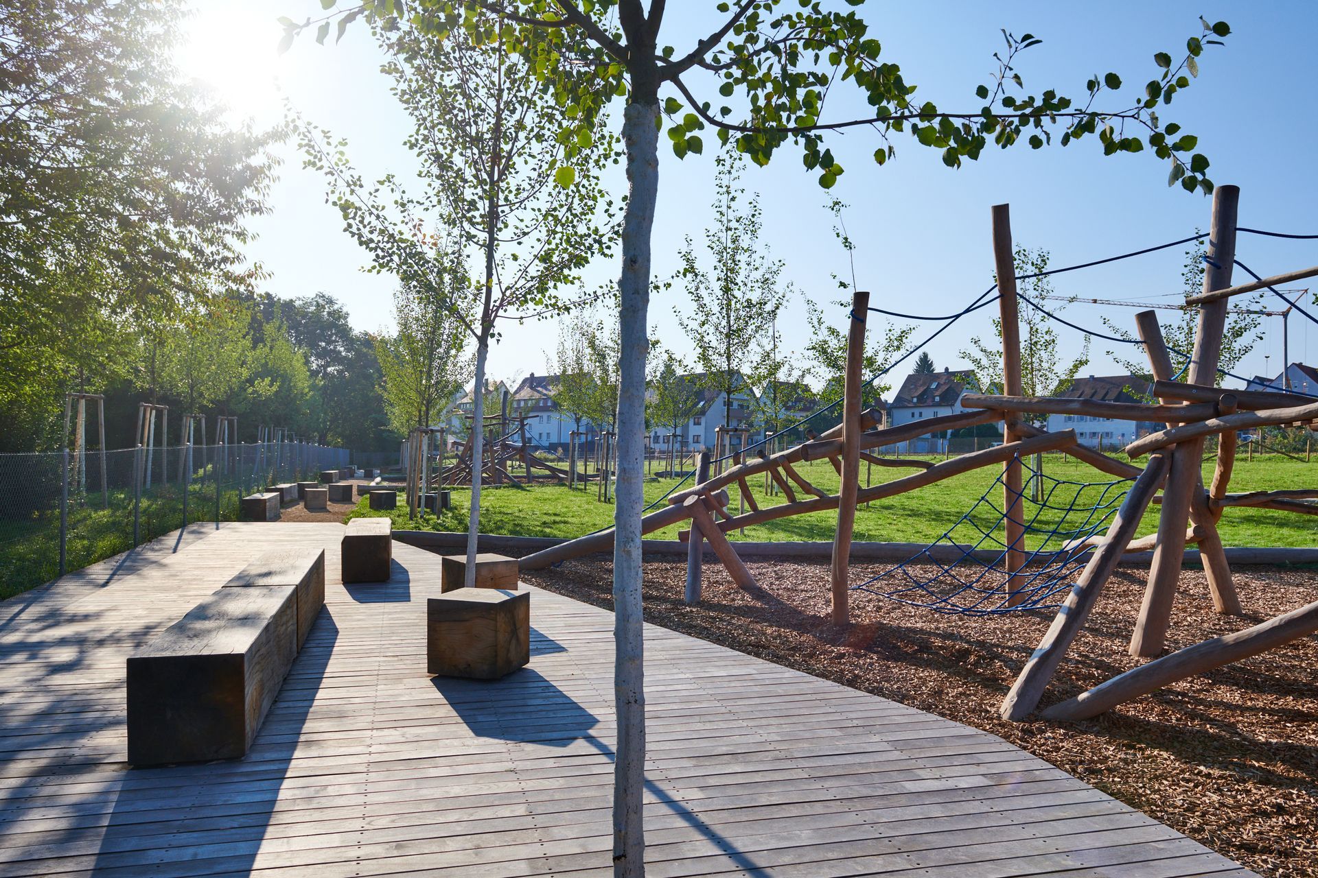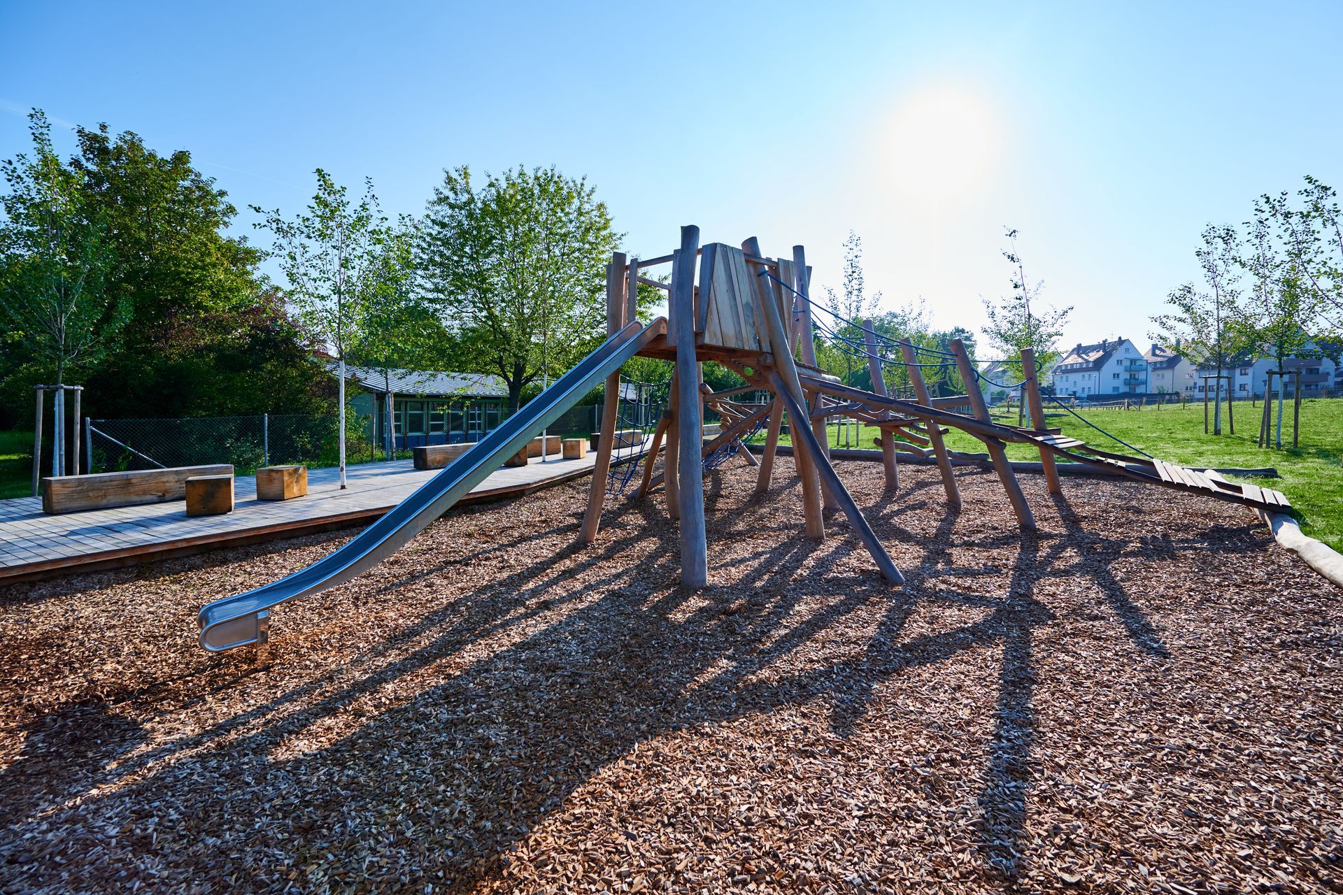 Auf einer angrenzenden Ackerfläche entstand während des Schulumbaus ein naturnaher Interimspausenhof. Mit einfachen, vollständig rückbaubaren Materialien, Spielflächen, Sitzstämmen und Blühwiesen bietet er Schüler:innen vielfältige Möglichkeiten zum Spielen und Verweilen und kann nach der Nutzungszeit kostengünstig zurückgebaut werden.