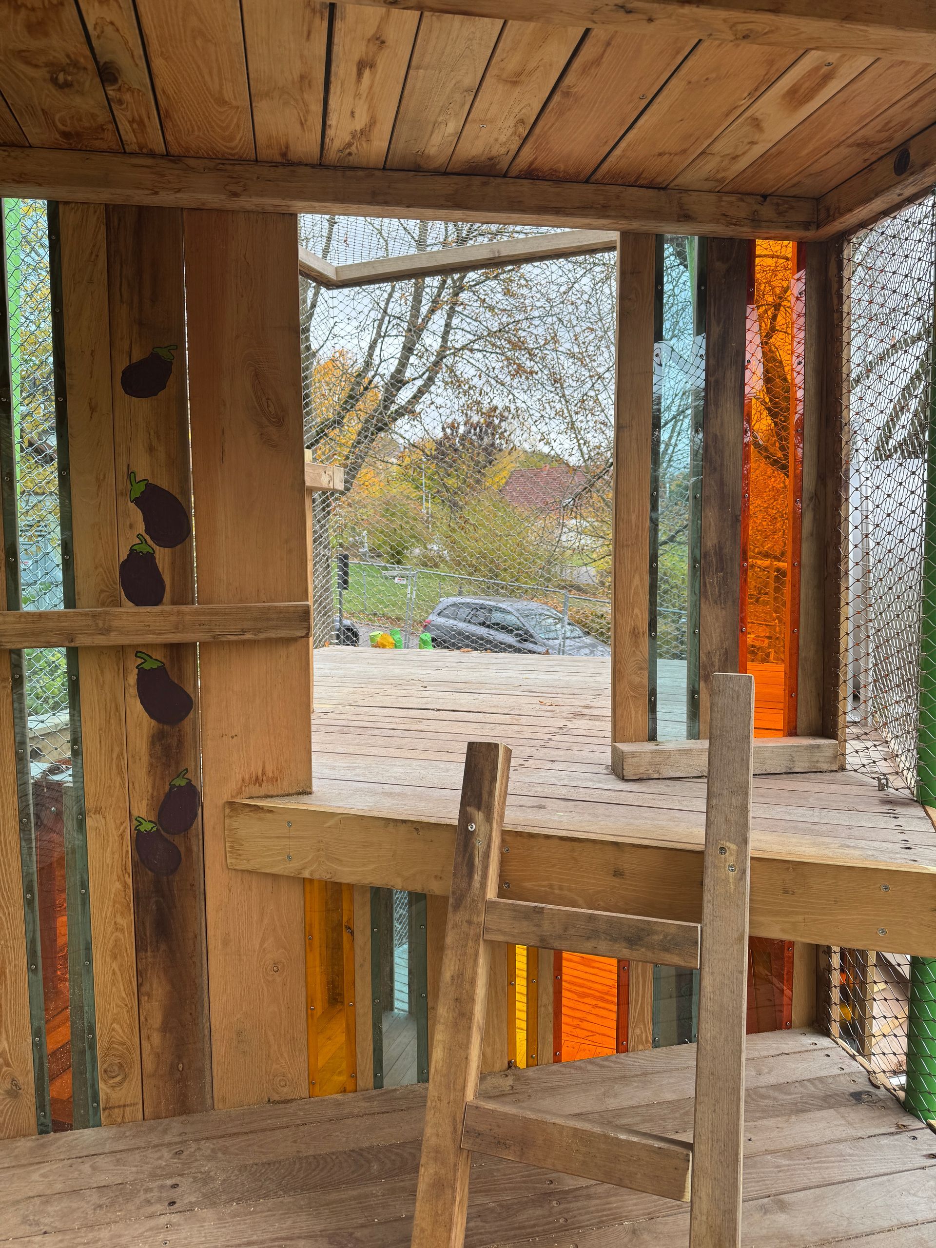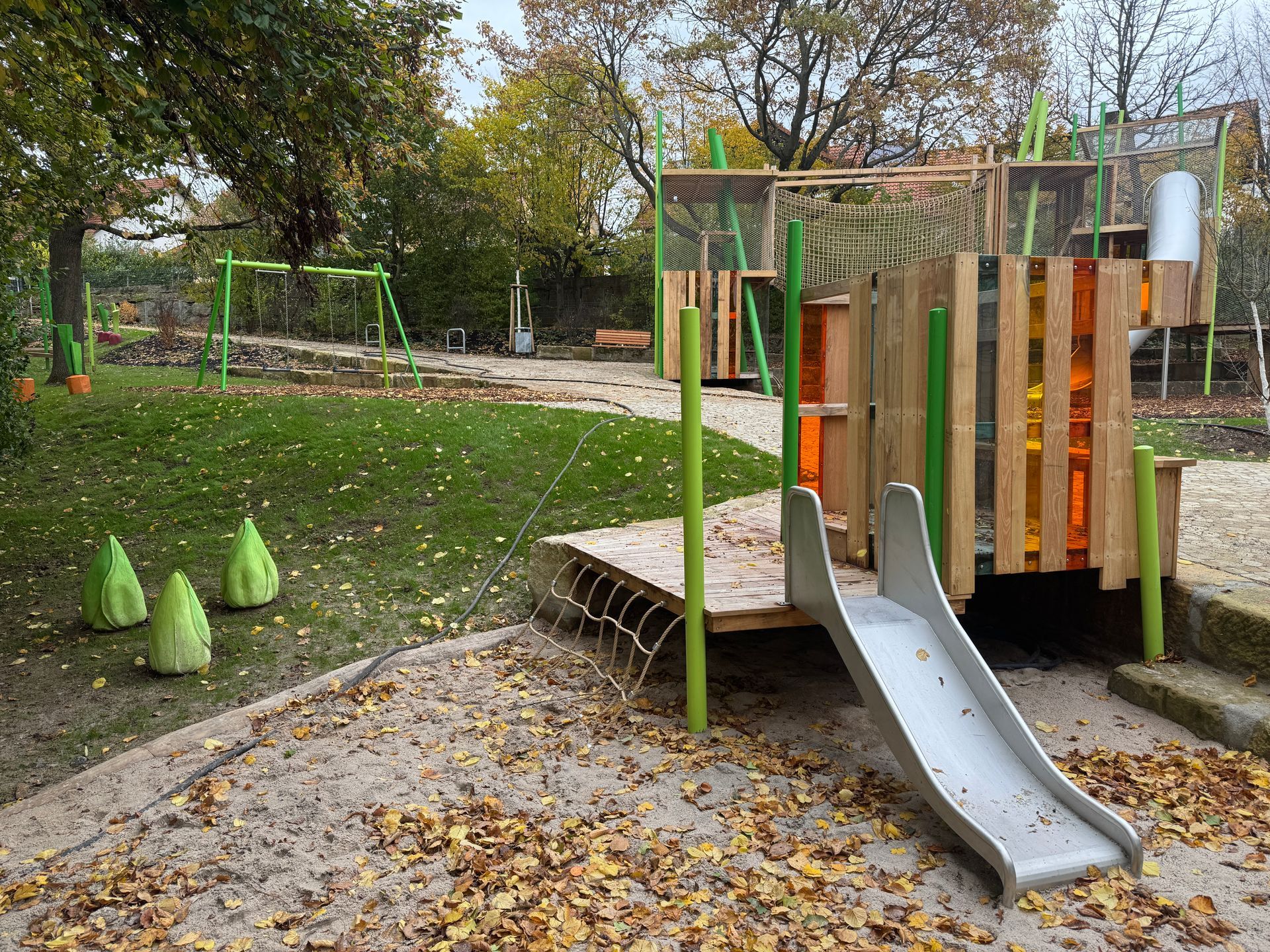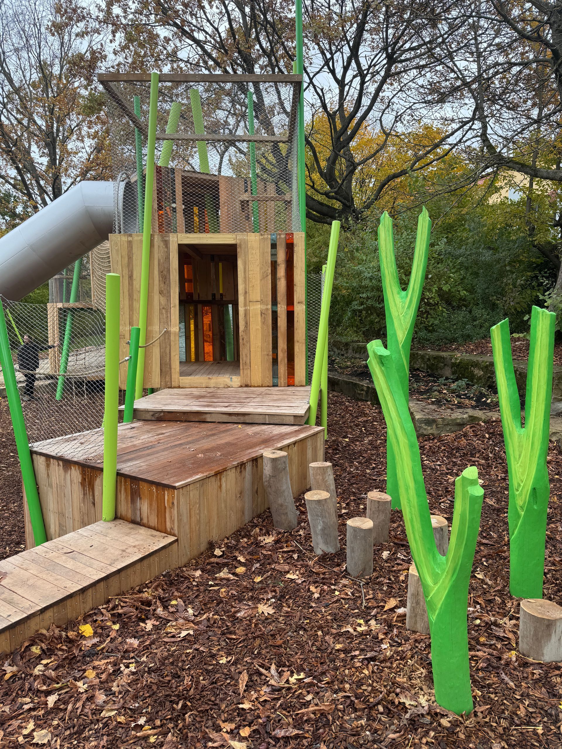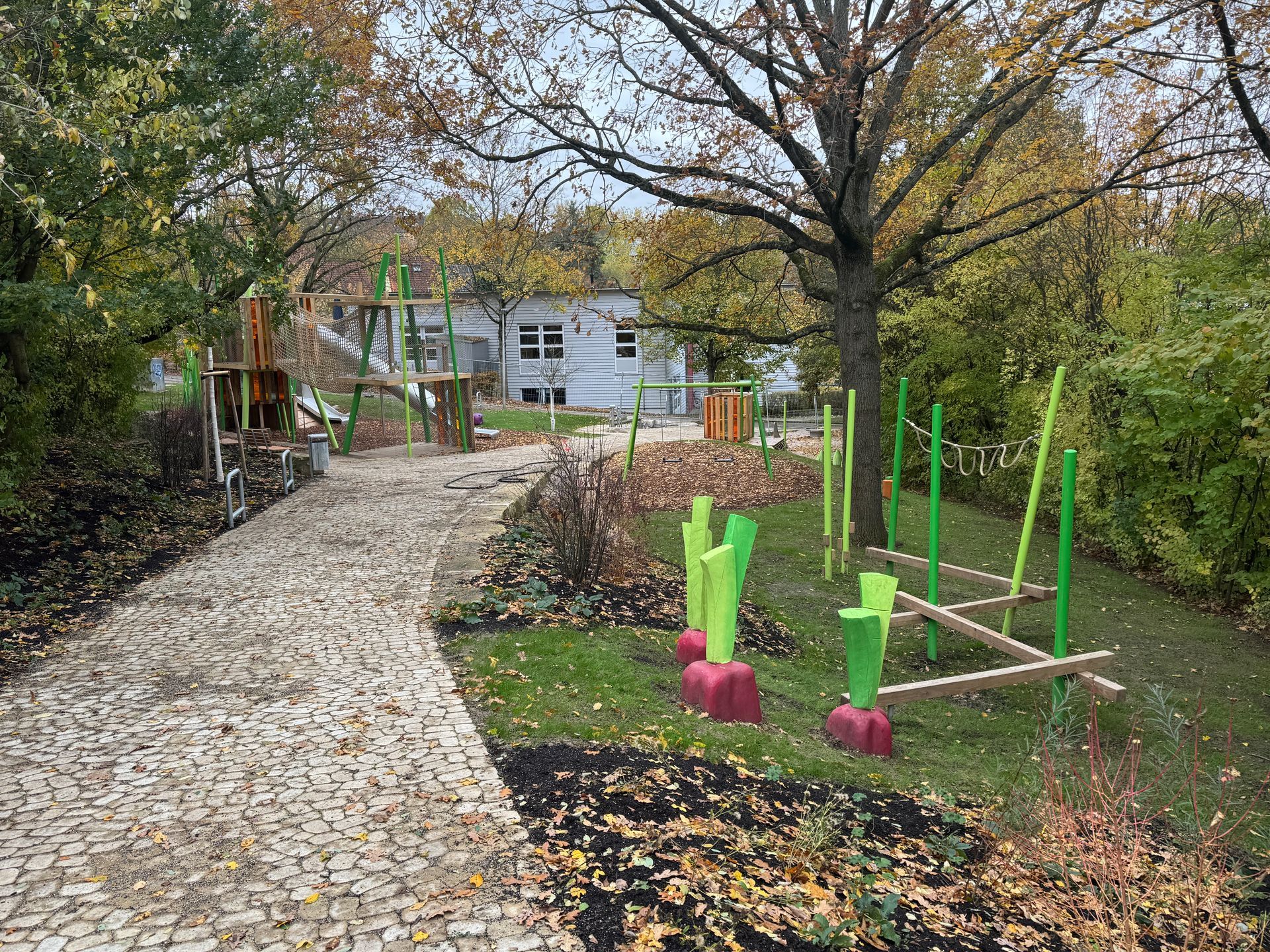 Unter dem Motto „Raum für junges Gemüse“ entsteht im Kohlpfad ein neuer Spielplatz für Kinder. Die raumprägende Hängebrücke wird aus den bestehenden Geräten übernommen und in ein neues Großspielgerät integriert. Gestapelte und schwebende Gemüsekisten aus Holz und Netzen bieten spannende Kletter- und Erlebnisräume, ergänzt durch verschiedene Rutschen, eine Doppelschaukel und einen Wasserspielbereich. Ein Spielwäldchen aus Weiden mit Balancierpfad und geschnitzte Gemüsefiguren wie Karotten, Radieschen und Kohlköpfe machen das Thema erlebbar und verleihen dem Spielplatz ein unverwechselbares Gesicht.