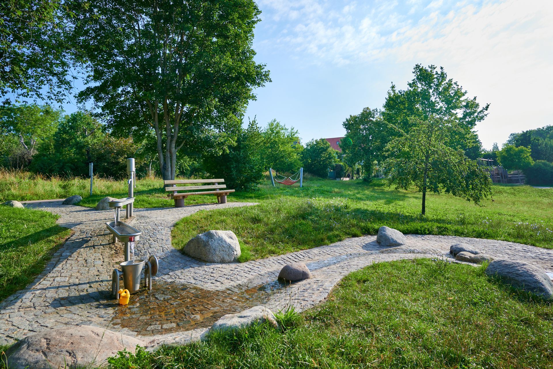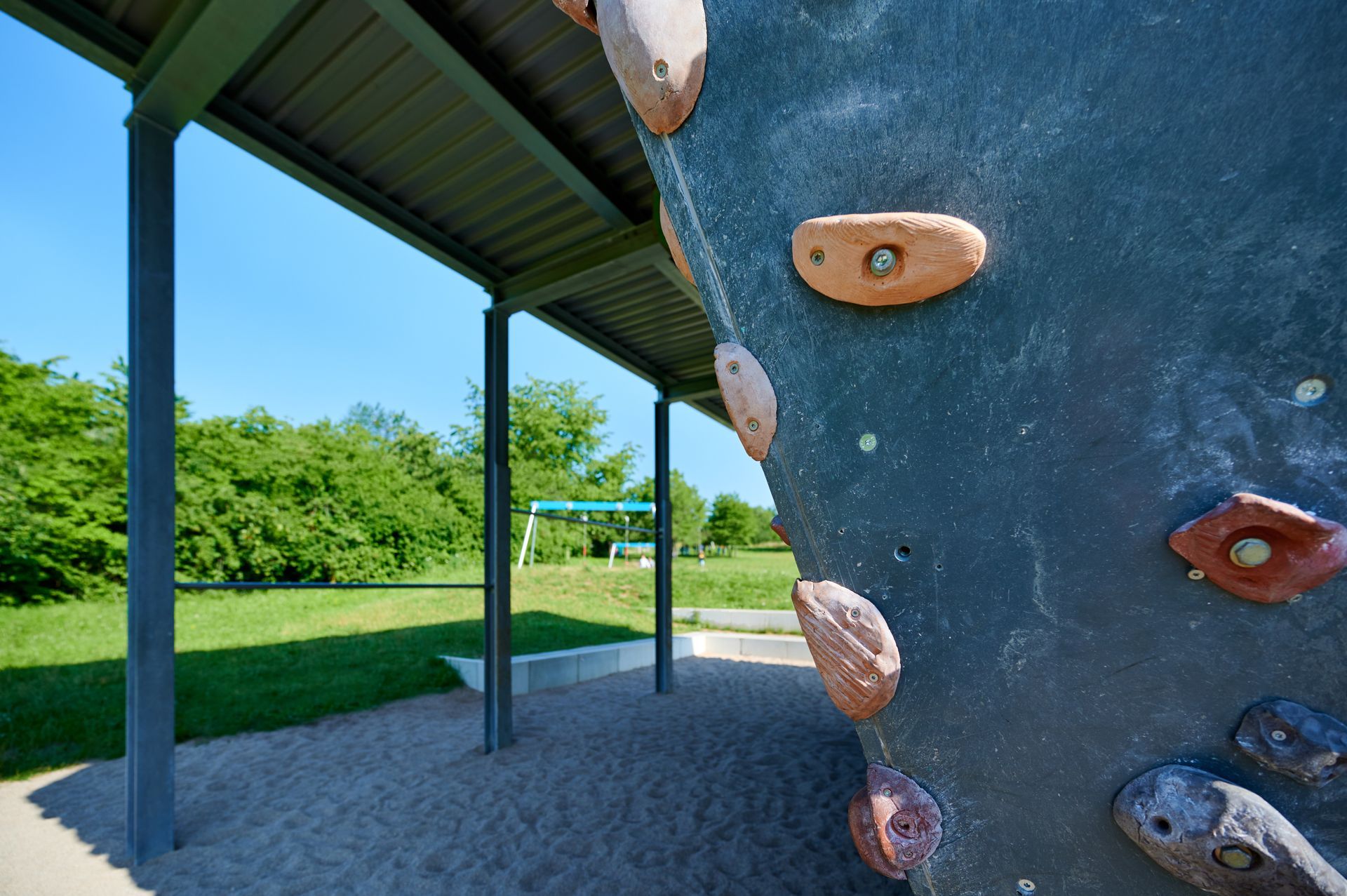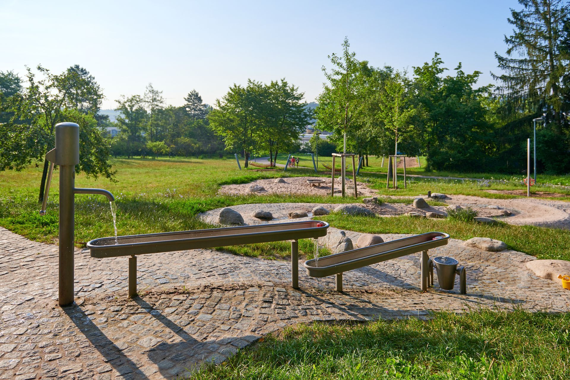 Im Schelmenäcker werden die Außenbereiche modernisiert und neu gestaltet. Der Wasserspielbereich fügt sich harmonisch in die vorhandene Topografie ein und endet in einer großen Sandlinse zum Matschen. Eine 40 m lange Seilbahn verbindet den Sportbereich am Kletterelement direkt mit dem Wasserspielbereich und sorgt für abwechslungsreichen Spielspaß.