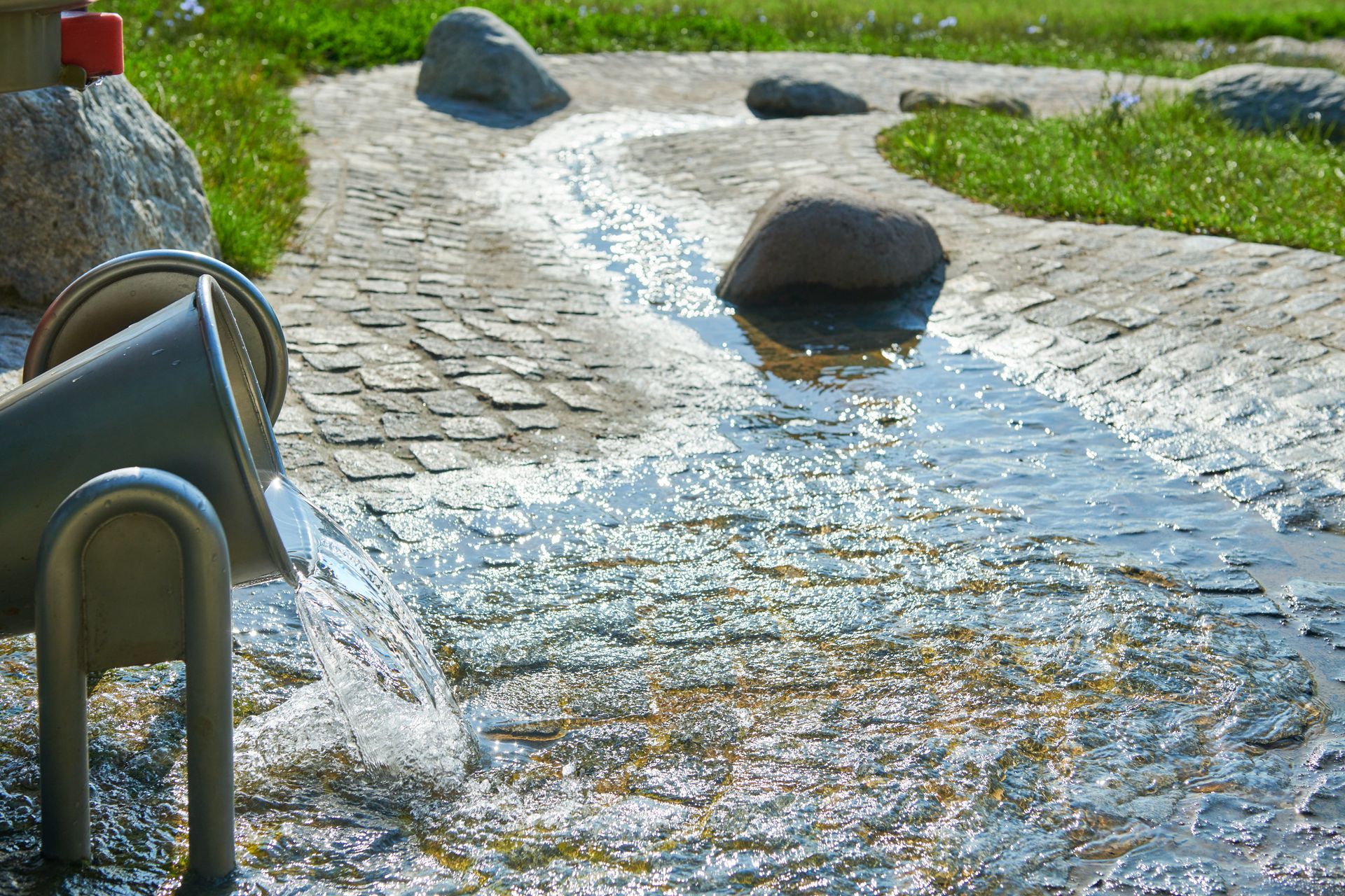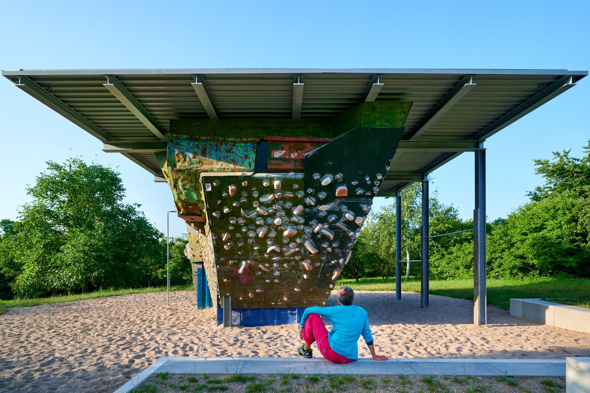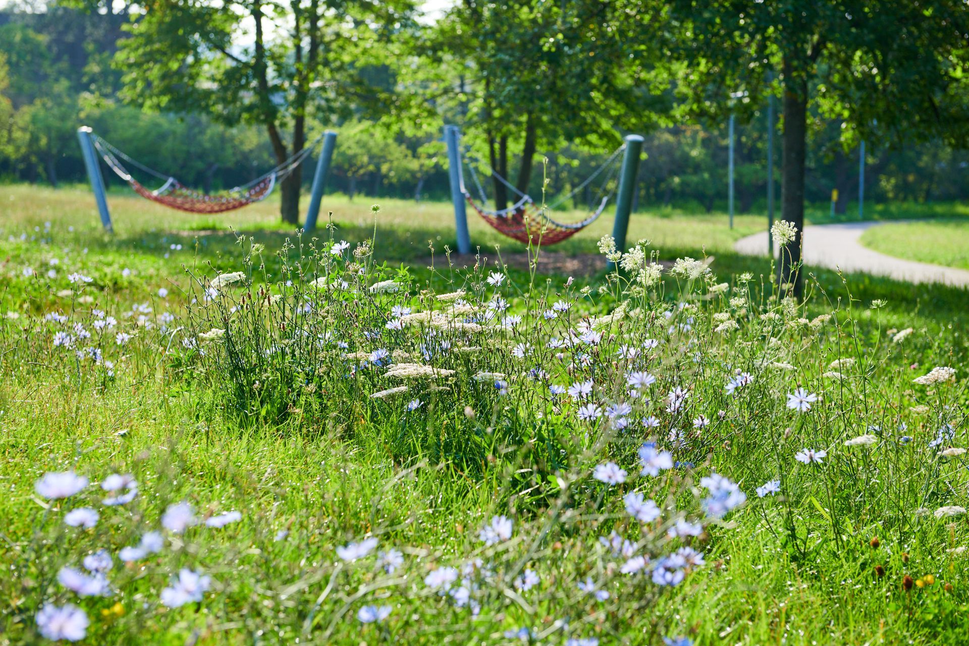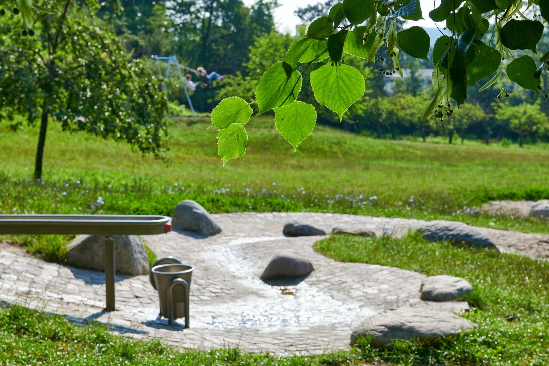 Im Schelmenäcker werden die Außenbereiche modernisiert und neu gestaltet. Der Wasserspielbereich fügt sich harmonisch in die vorhandene Topografie ein und endet in einer großen Sandlinse zum Matschen. Eine 40 m lange Seilbahn verbindet den Sportbereich am Kletterelement direkt mit dem Wasserspielbereich und sorgt für abwechslungsreichen Spielspaß.