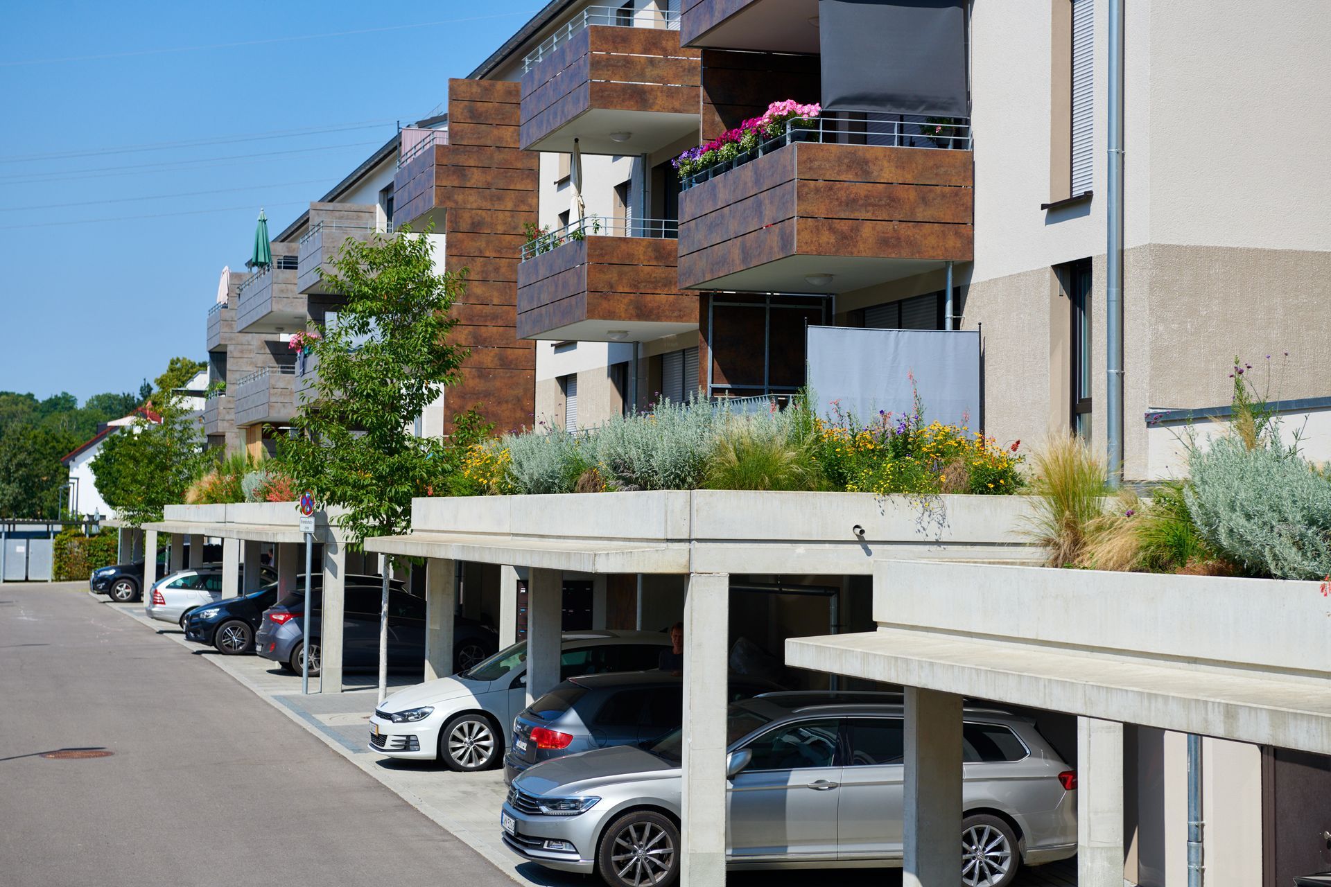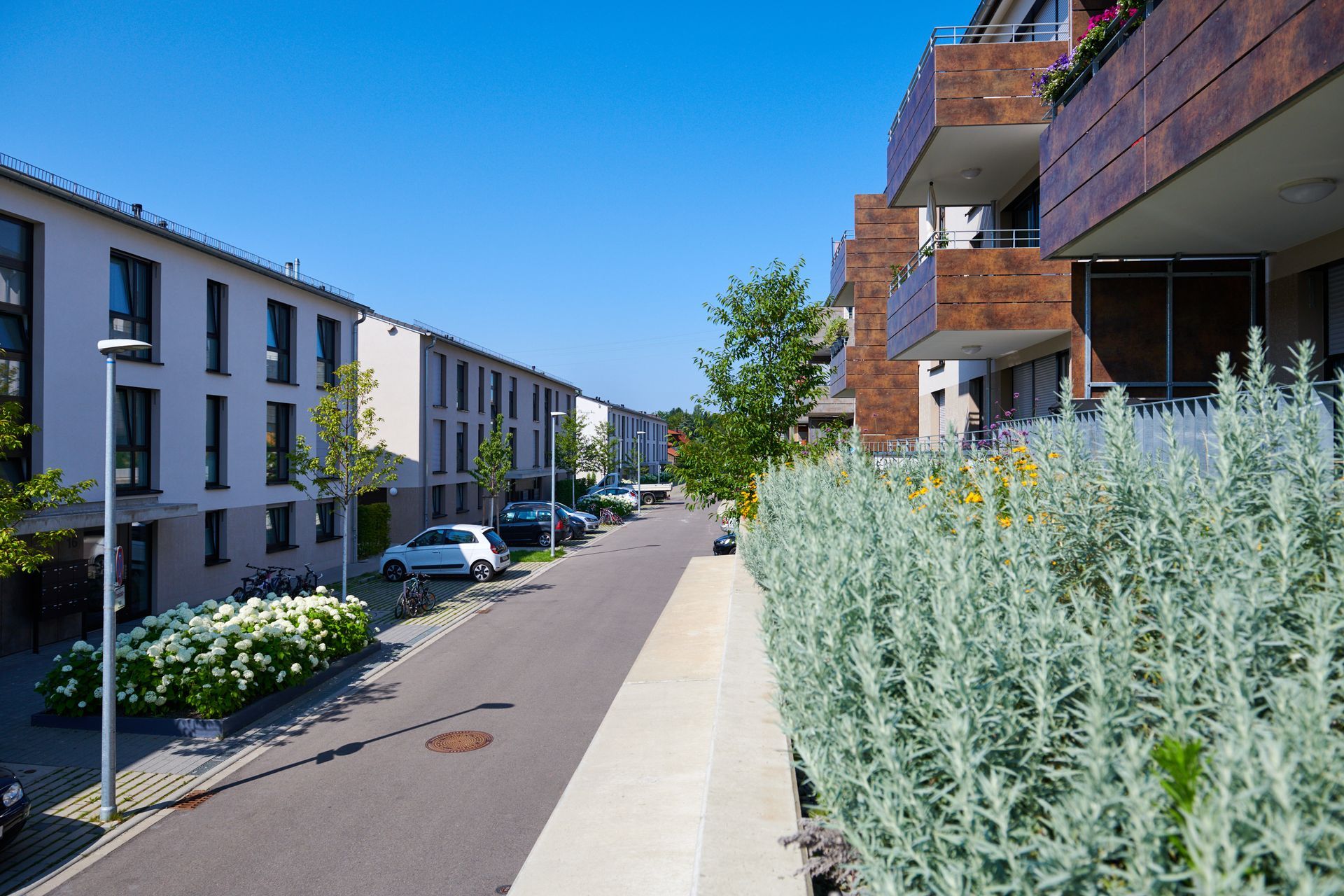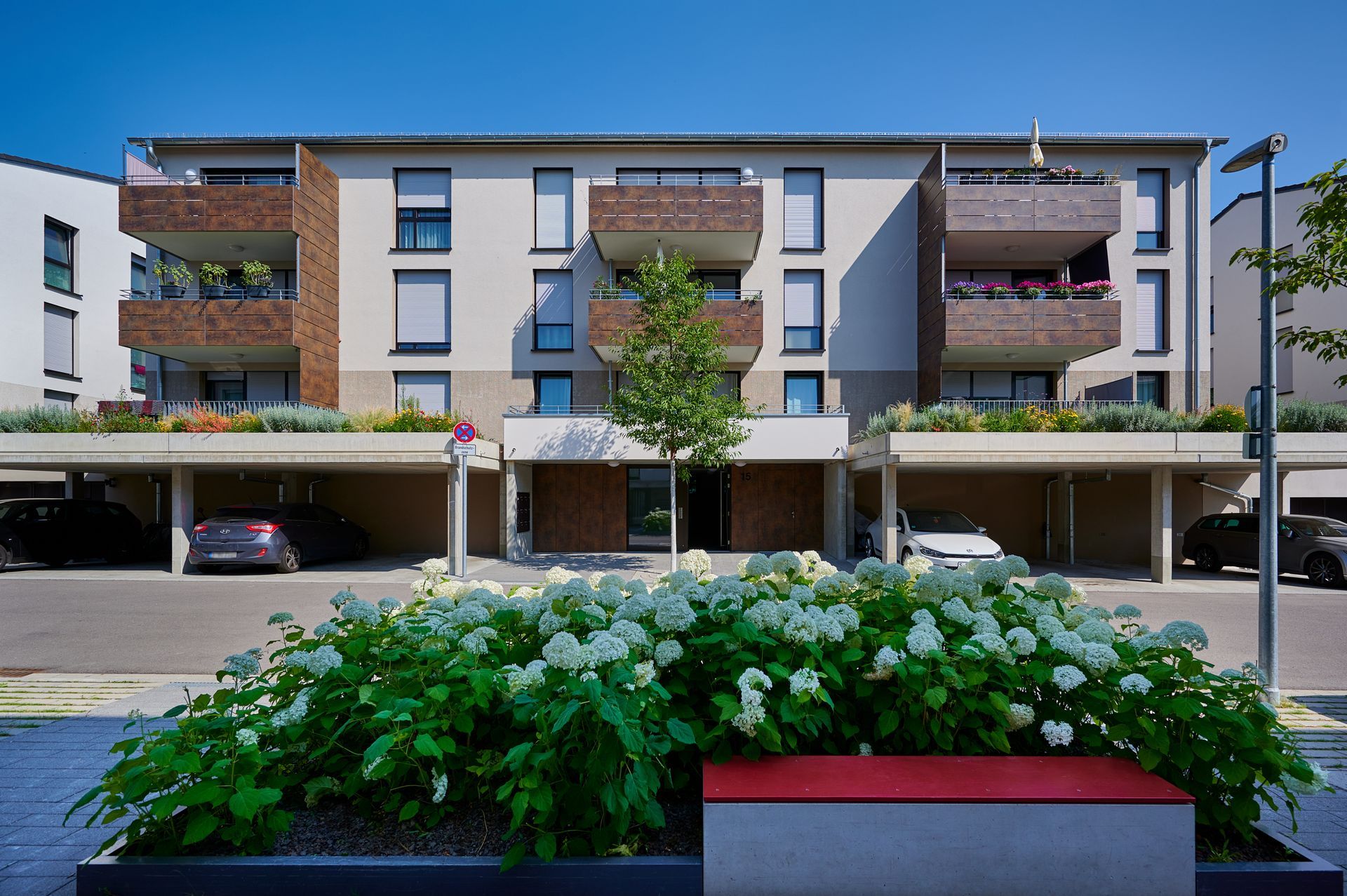 Rund um das Wohnviertel im unteren Hurtweg entsteht eine neue, einladende Außenanlage. Baumreihen strukturieren die Wege und sorgen für Schatten und Orientierung, während begrünte Garagendächer und zusätzliche grüne Stellplätze den Raum nachhaltig aufwerten. Überall blühen weiße Hortensien und schaffen eine freundliche, naturnahe Atmosphäre – ein Ort, der zum Verweilen, Spazieren und Genießen einlädt.