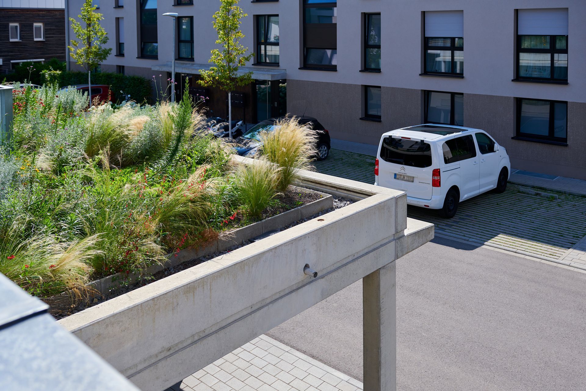 Rund um das Wohnviertel im unteren Hurtweg entsteht eine neue, einladende Außenanlage. Baumreihen strukturieren die Wege und sorgen für Schatten und Orientierung, während begrünte Garagendächer und zusätzliche grüne Stellplätze den Raum nachhaltig aufwerten. Überall blühen weiße Hortensien und schaffen eine freundliche, naturnahe Atmosphäre.