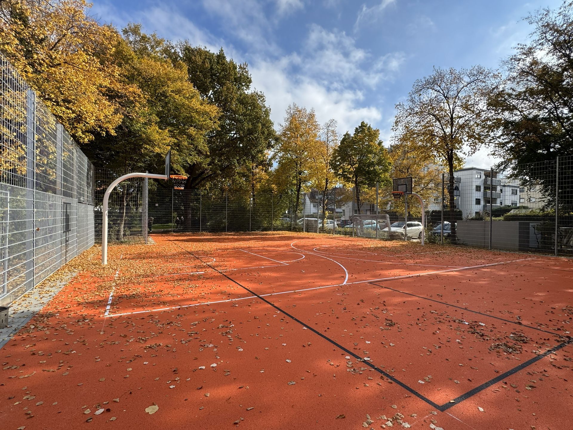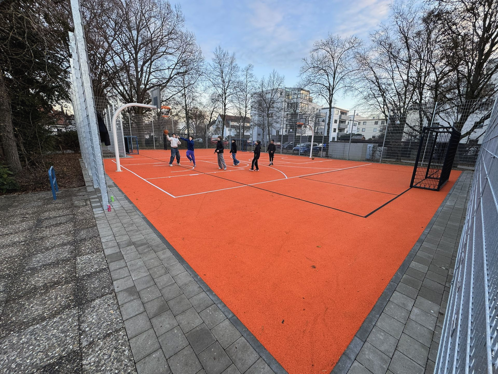 Die Außenanlage der Goldwiesenschule wird erneuert. Der bisherige Sportbereich wird erneuert und zu einem kombinierten Basketball- und Fußballplatz mit robustem EPDM-Belag umgestaltet. In anderen Bereichen des Schulhofs wird der Belag stellenweise ausgetauscht, sodass sich Nutzbarkeit und Erscheinungsbild verbessern, ohne die gesamte Fläche zu öffnen. Die neuen Fahrradbügel bringen farbige Akzente in den Schulhof.