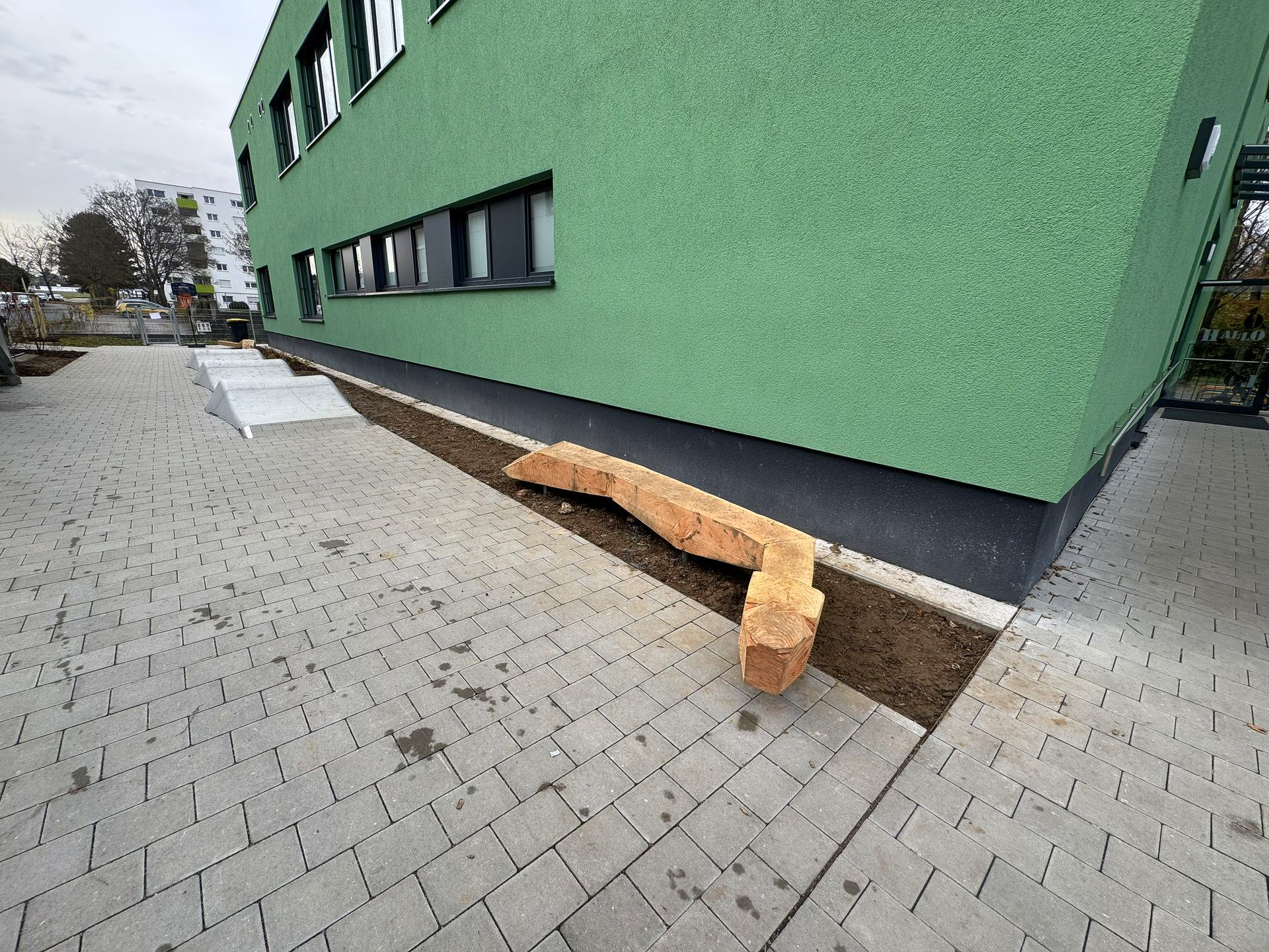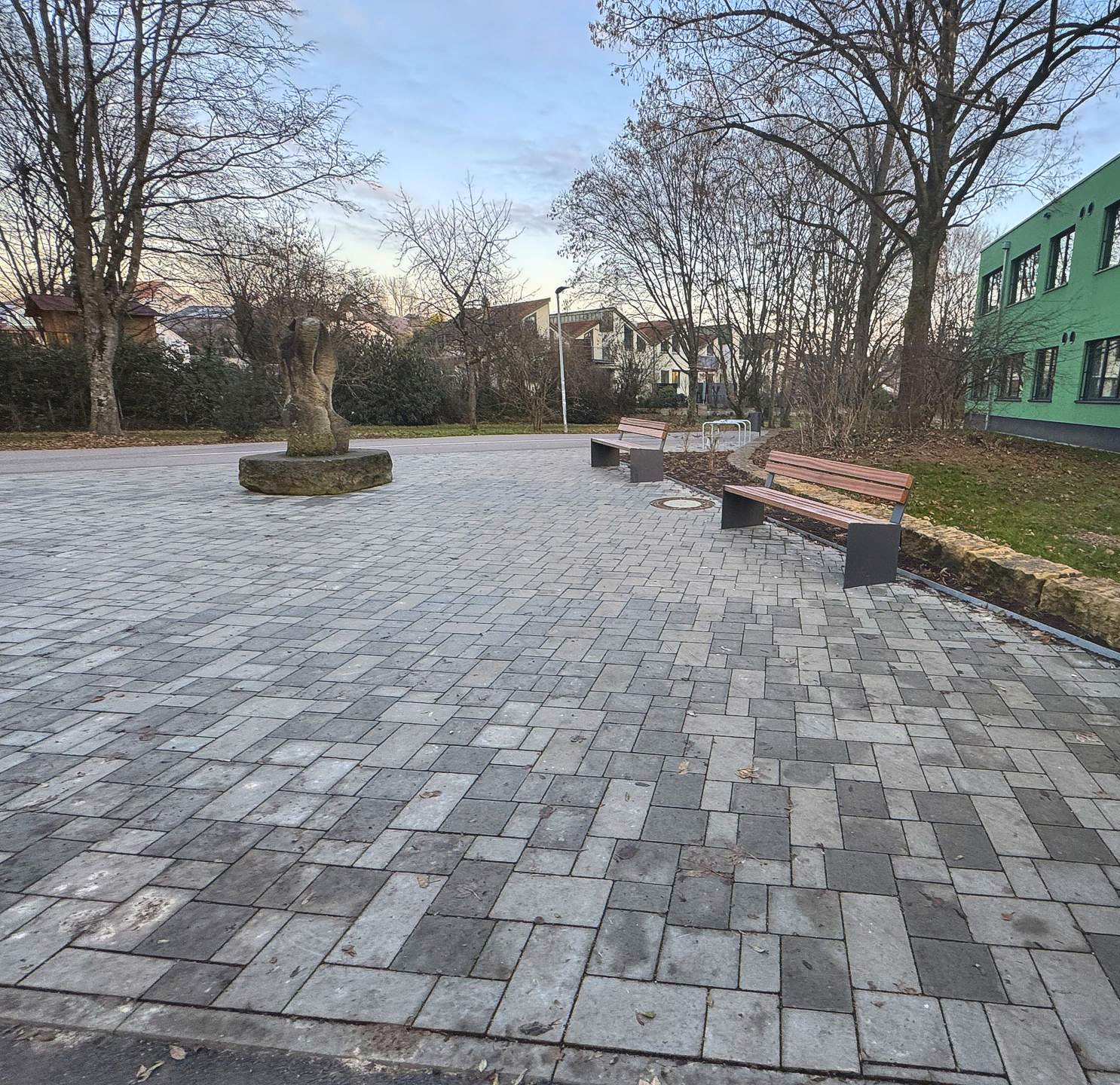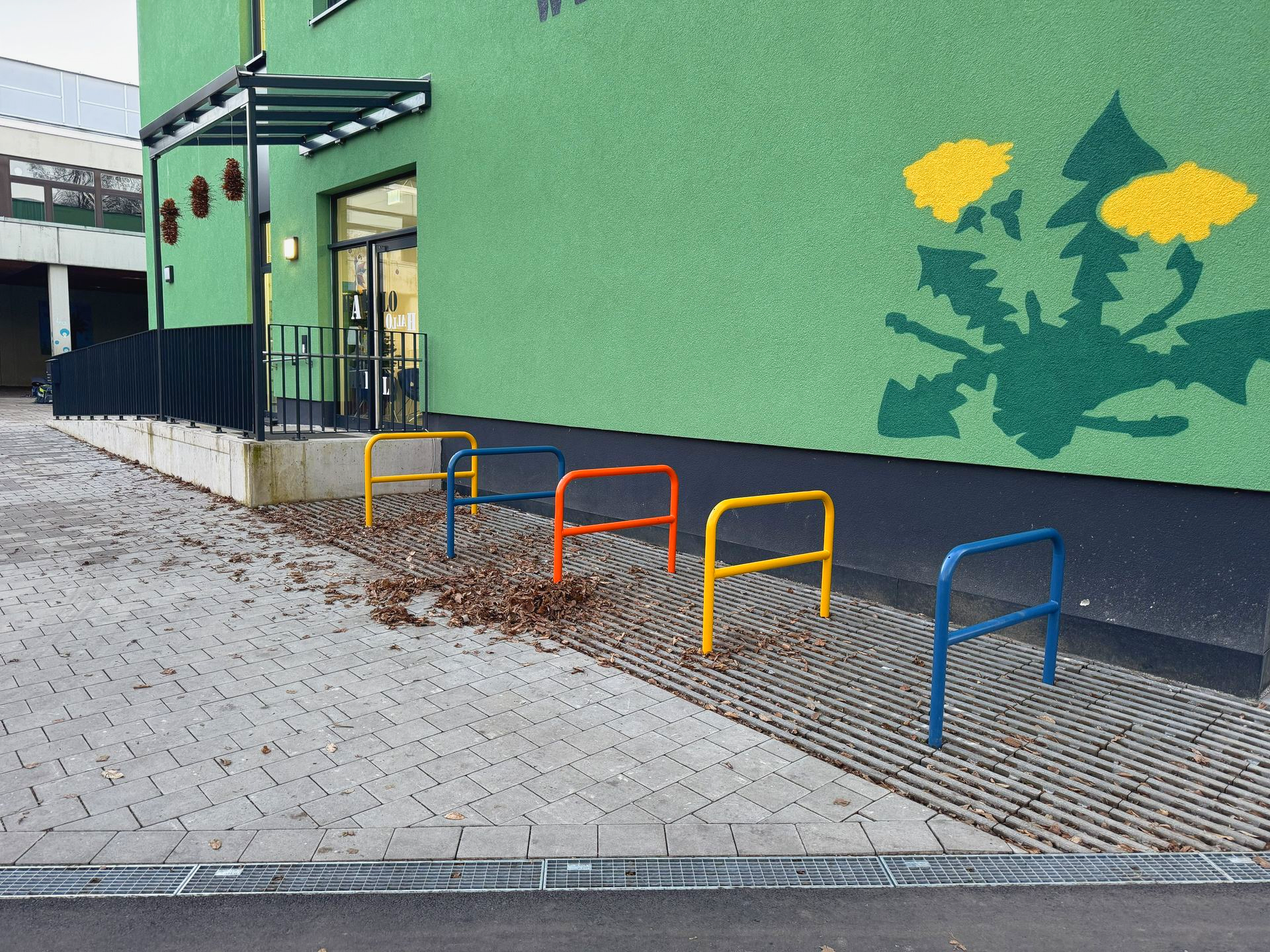 stellenweise ausgetauscht, sodass sich Nutzbarkeit und Erscheinungsbild verbessern, ohne die gesamte Fläche zu öffnen. Die neuen Fahrradbügel bringen farbige Akzente in den Schulhof.