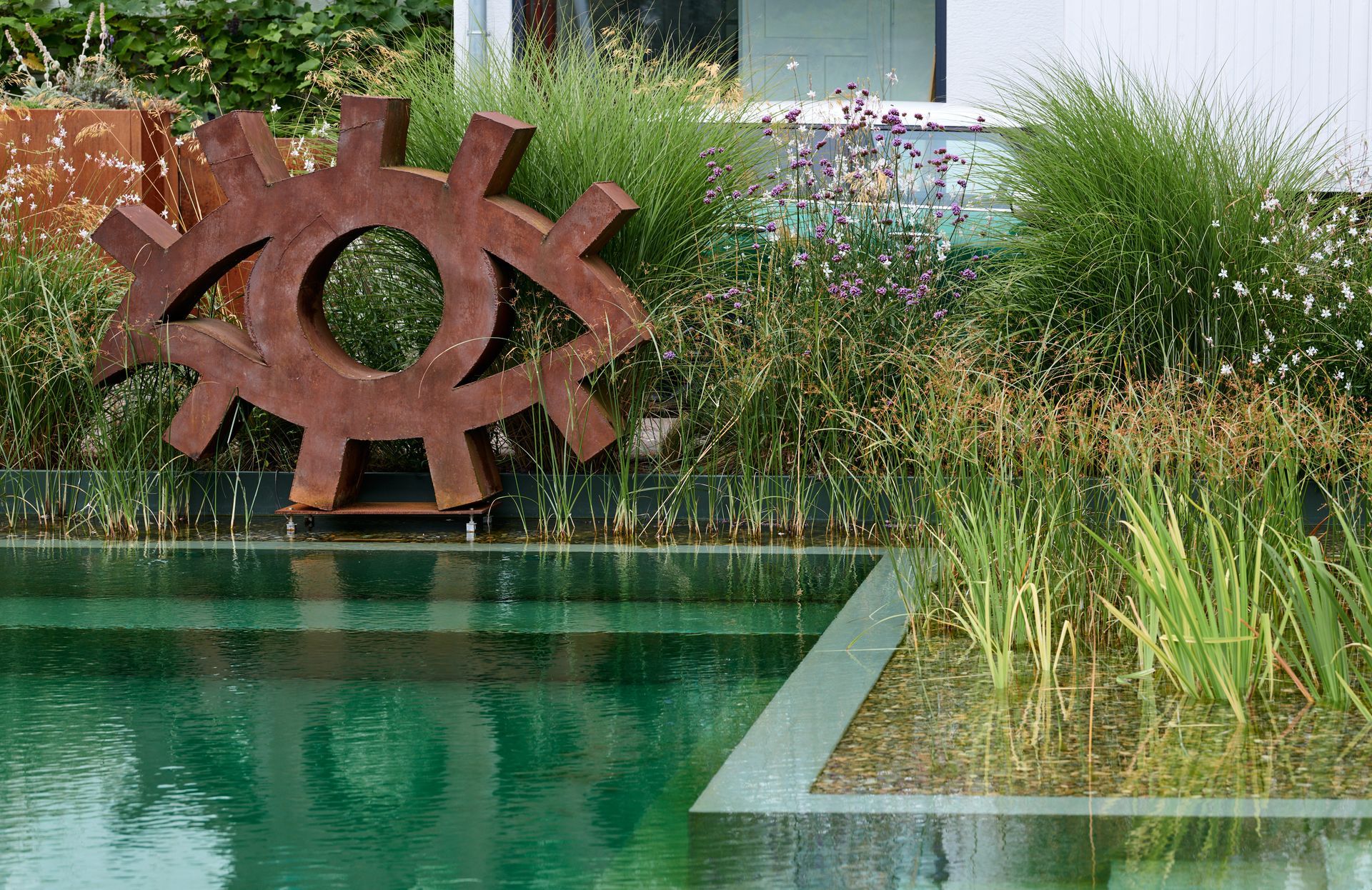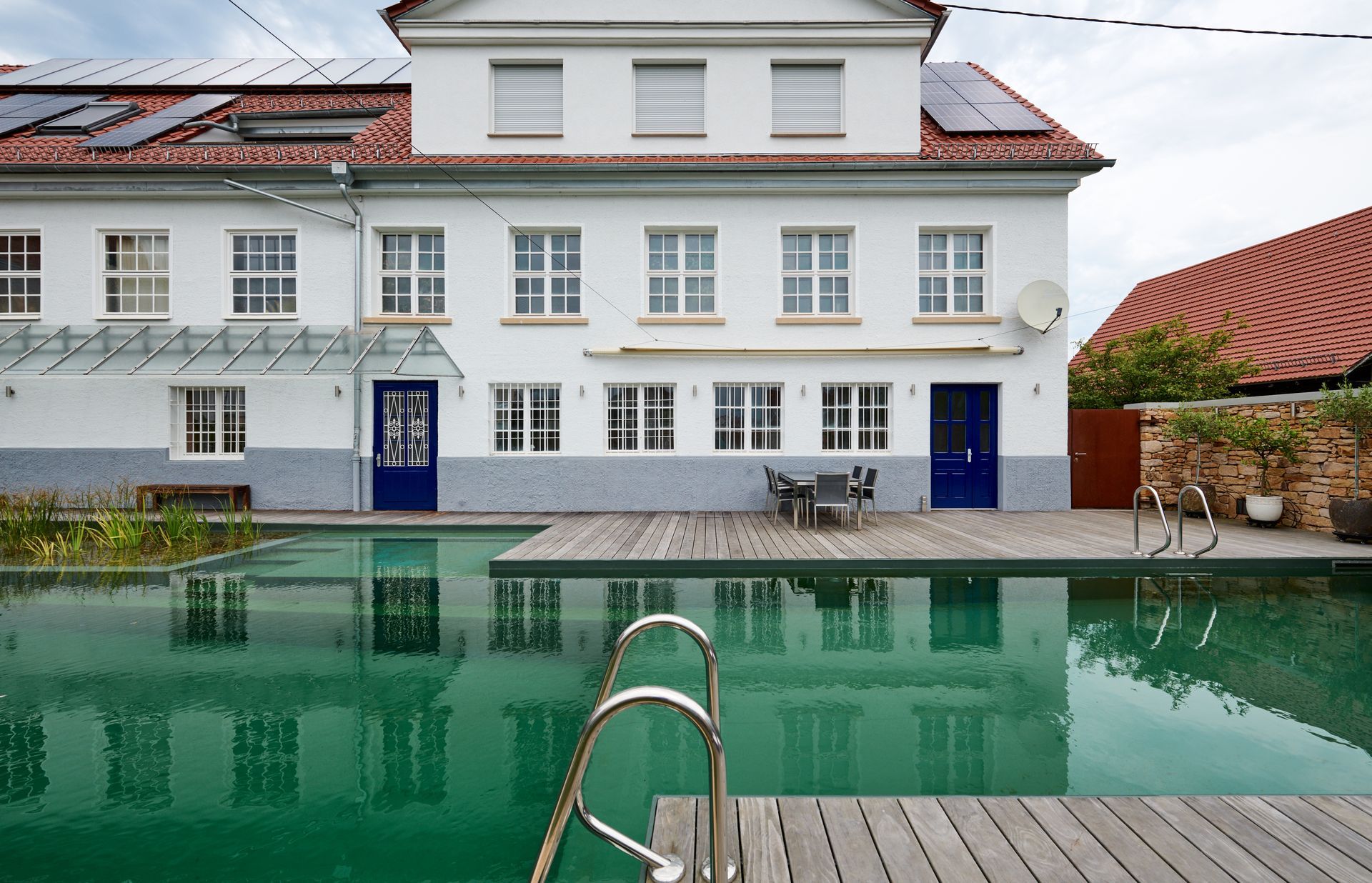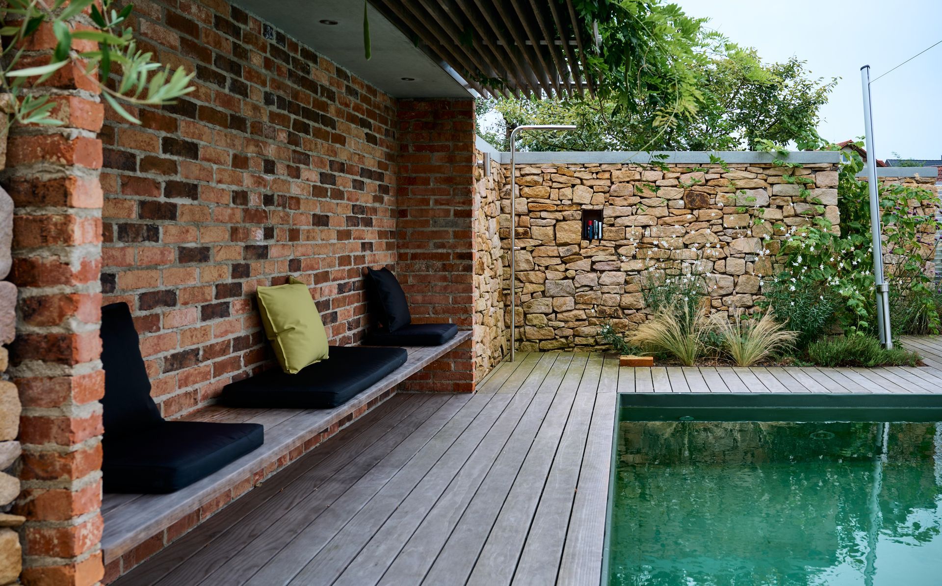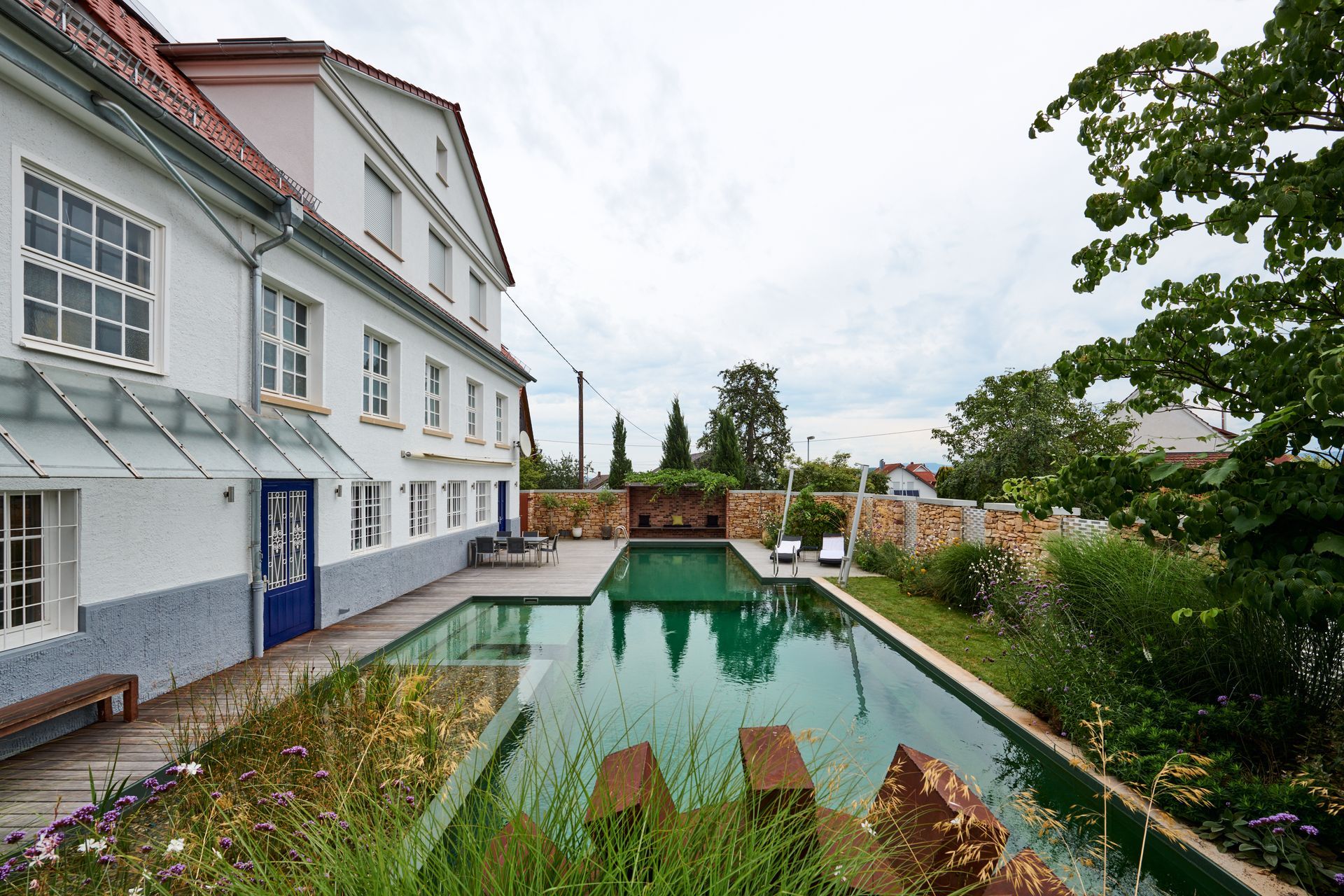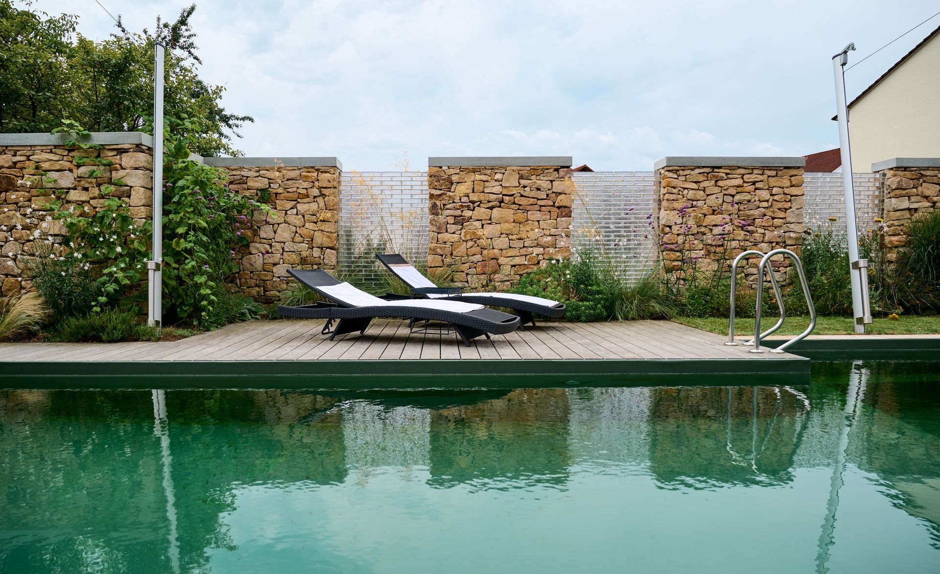 Aus dem straßenseitigen Garten entsteht eine elegante Pool- und Wasserlandschaft. Im Zentrum liegt der rund 20 m lange Naturpool, eingerahmt von üppiger Grünkulisse. Eine ca. 2 m hohe Natursteinmauer mit Glaslichtdurchlässen setzt das Beleuchtungskonzept wirkungsvoll in Szene. Zwei Terrassen am Wasser, umgeben von Gräsern, Stauden und Großgehölzen, laden zum Verweilen ein. Wetlounge und Gartendusche runden das Ensemble ab.