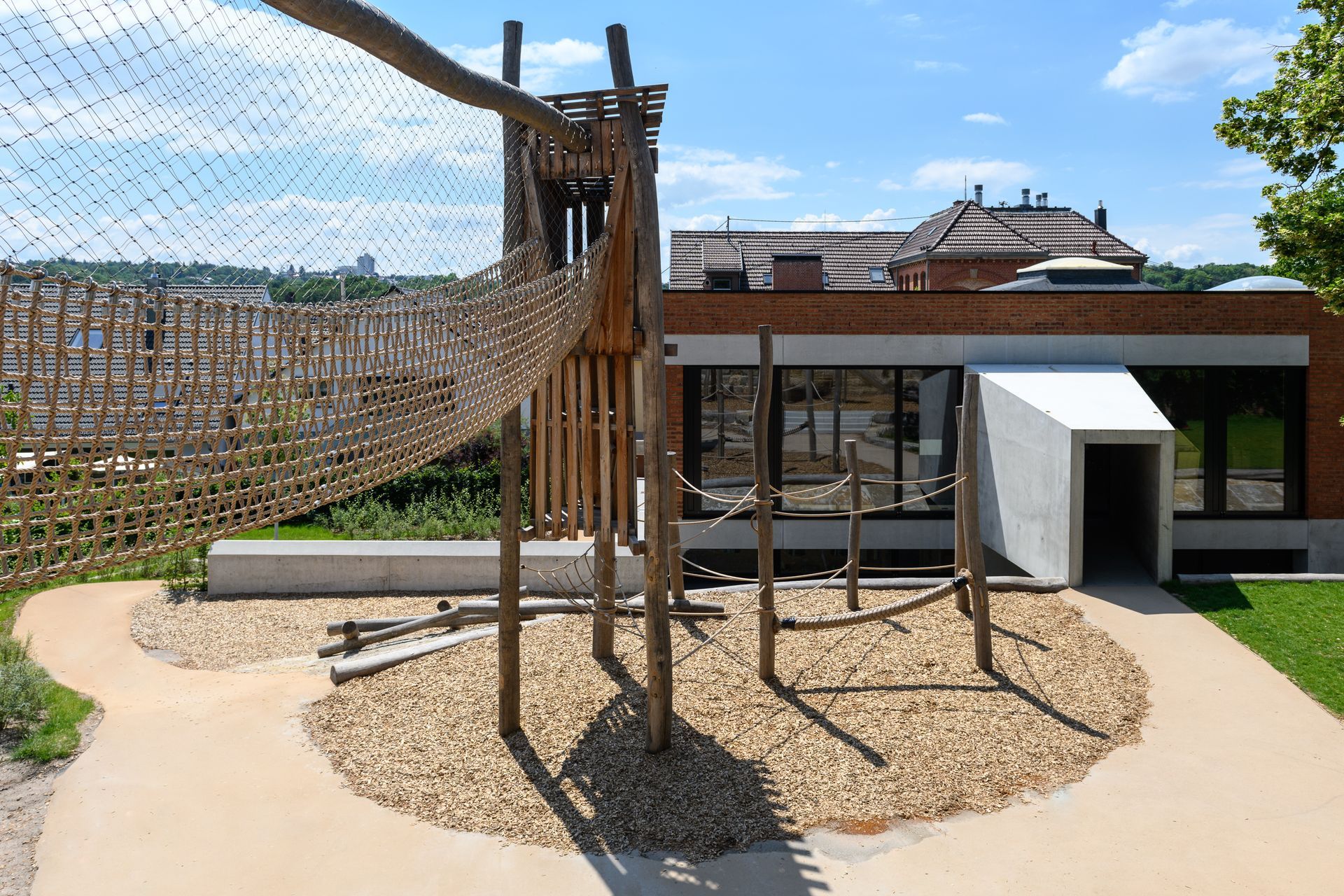 Auf dem Gelände der alten Schule entstand ein neues Kinder- und Familienzentrum mit vielfältigen Spiel- und Aufenthaltsbereichen. Zwei Ebenen mit Rasenflächen, Sand- und Wasserspiel, Gemüse- und Beerengarten sowie einheimischen Bäumen bieten Kindern aller Altersgruppen Raum zum Spielen, Entdecken und Lernen.