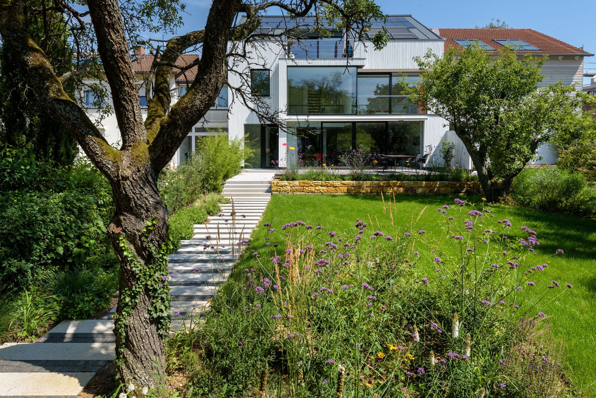 Das Wohnhaus wird nach den Bedürfnissen des Bauherren vollständig saniert. Lineare Platten mit Natursteinbändern führen vom Gehweg zum Eingang, vor der Küche mit duftendem kriechendem Thymian. Im Garten verbindet ein Belagsband mit ausgezahntem Rand Terrasse und Garage. Alte Obstbäume bleiben erhalten, punktuelle Staudenpflanzungen setzen bunte Akzente in der großzügigen Rasenfläche.