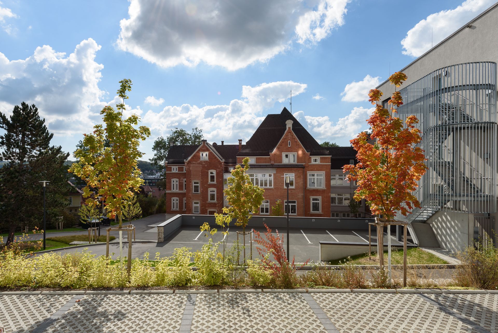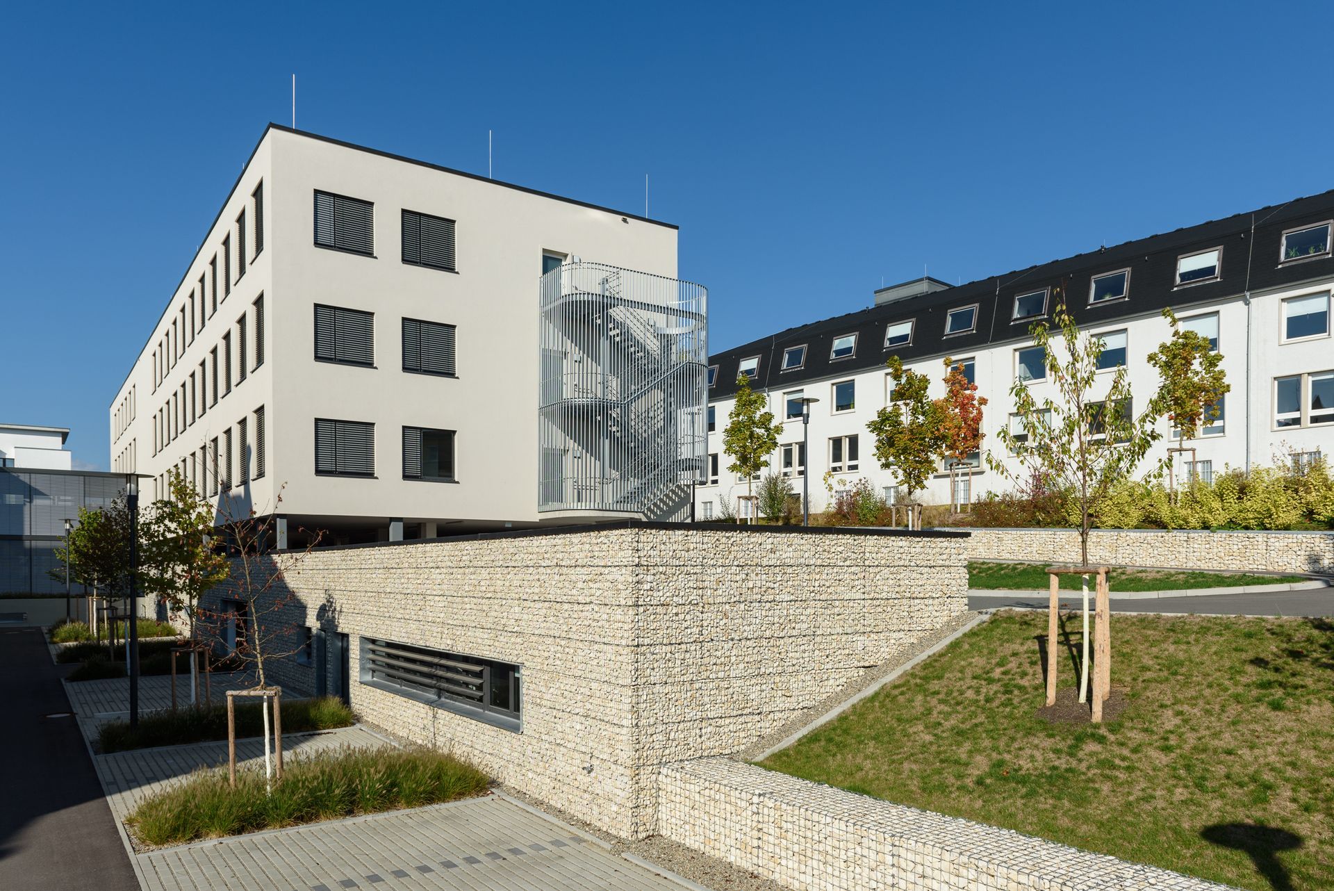 Mit der Erweiterung des Landratsamtes wurden auch die Außenanlagen neu gestaltet: Helle Pflasterbeläge und Jura-Gabionen prägen das Bild, Gräserflächen und Amberbäume lockern die Parkbereiche auf. Barrierefreie Wege und ausreichend Parkplätze sorgen für gute Erreichbarkeit. Ein neu gestalteter Innenhof bietet ruhige Aufenthaltsräume für Pausen und Besprechungen.