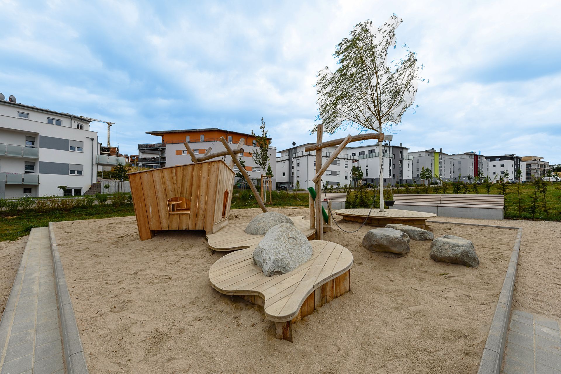 Der neue Spielplatz gliedert sich in verschiedene Bereiche für Klein- und Schulkinder. Eine Sandfläche, Ententürme mit Rutsche, Kletterpfad und Balancierelemente schaffen vielfältige Spiel- und Bewegungsmöglichkeiten. Sitzgelegenheiten und Bepflanzungen machen den Ort zugleich zu einem angenehmen Treffpunkt für Familien.