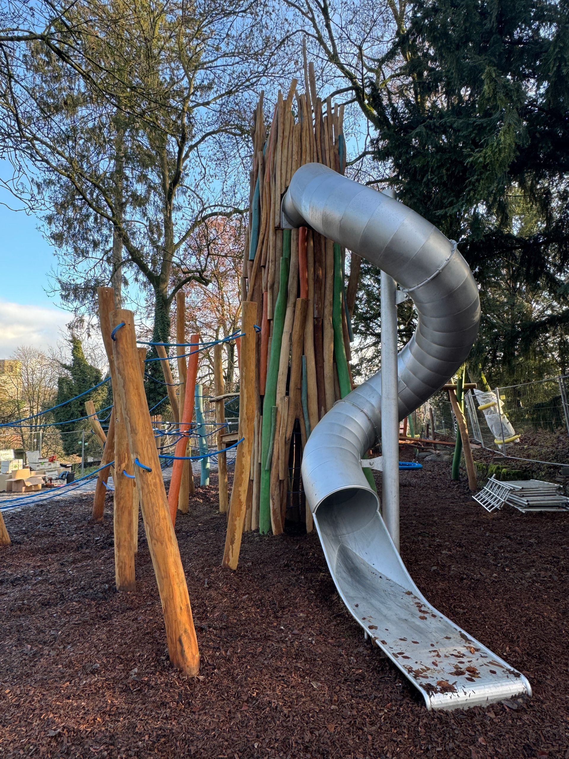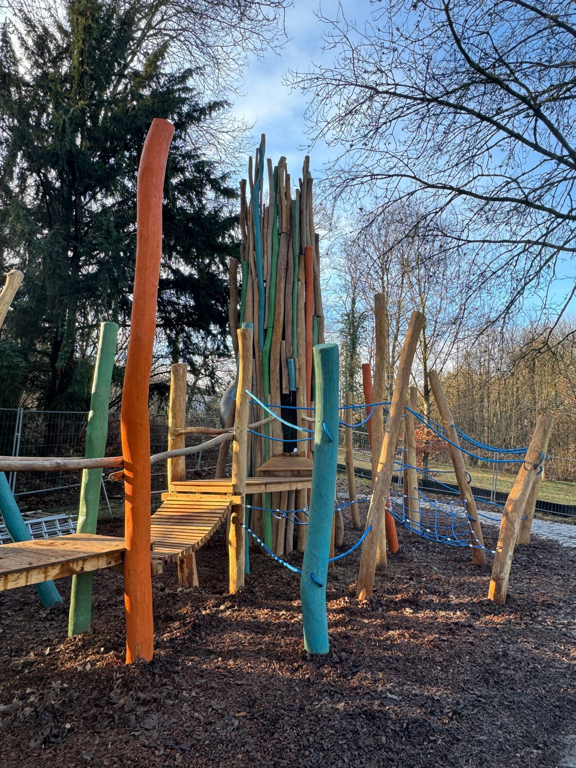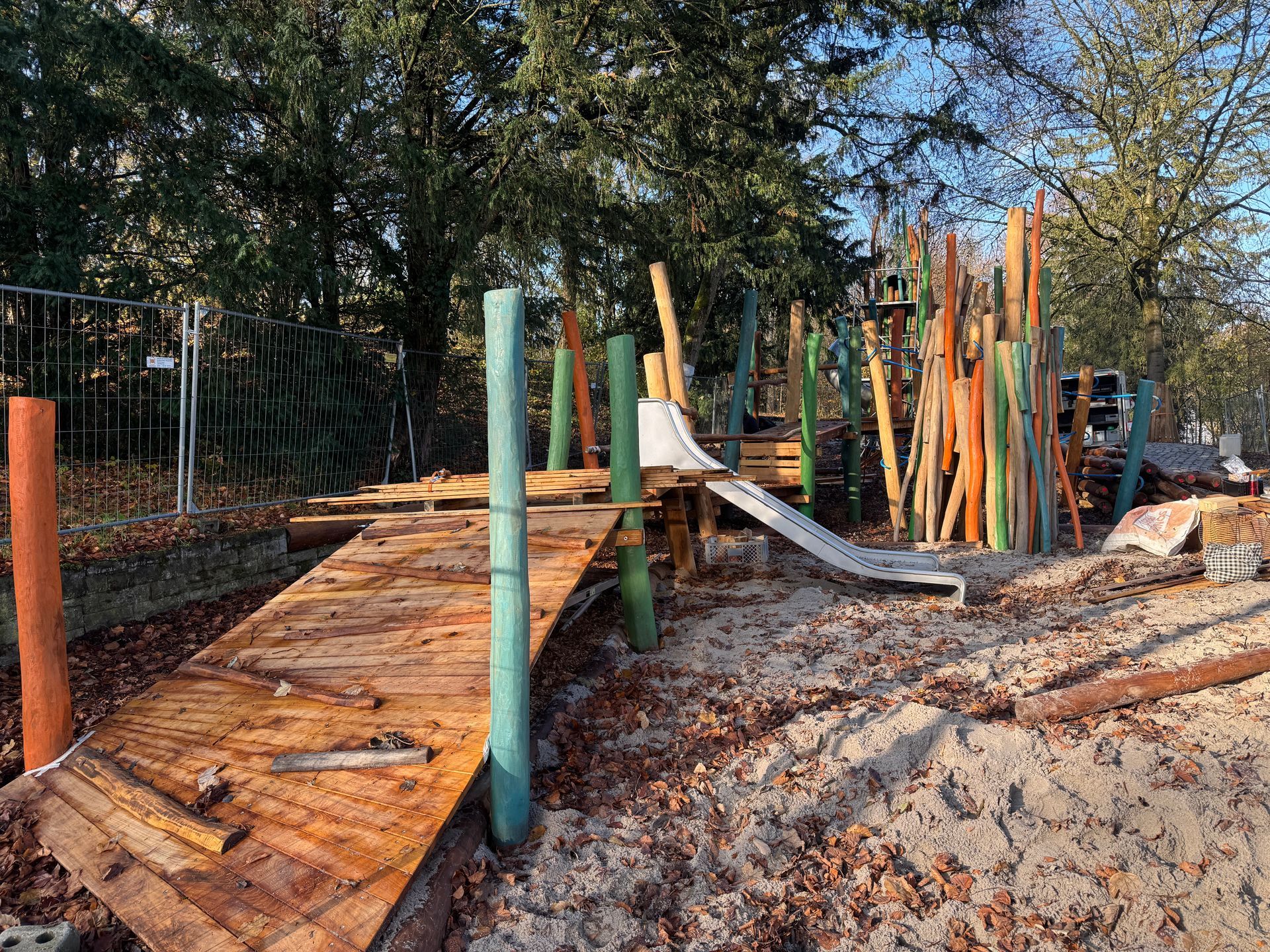 In Stuttgart-Mühlhausen entsteht ein neuer Spielplatz, der Kinder jeden Alters zum Toben und Entdecken einlädt. Für die Kleinen gibt es geschützte Bereiche zum sicheren Spielen, während ältere Kinder auf Holzstämmen balancieren, klettern, schaukeln und rutschen können. Verschiedene Spielgeräte und naturnahe Elemente schaffen eine bunte, lebendige Umgebung voller Bewegung, Spaß und gemeinsamer Abenteuer.