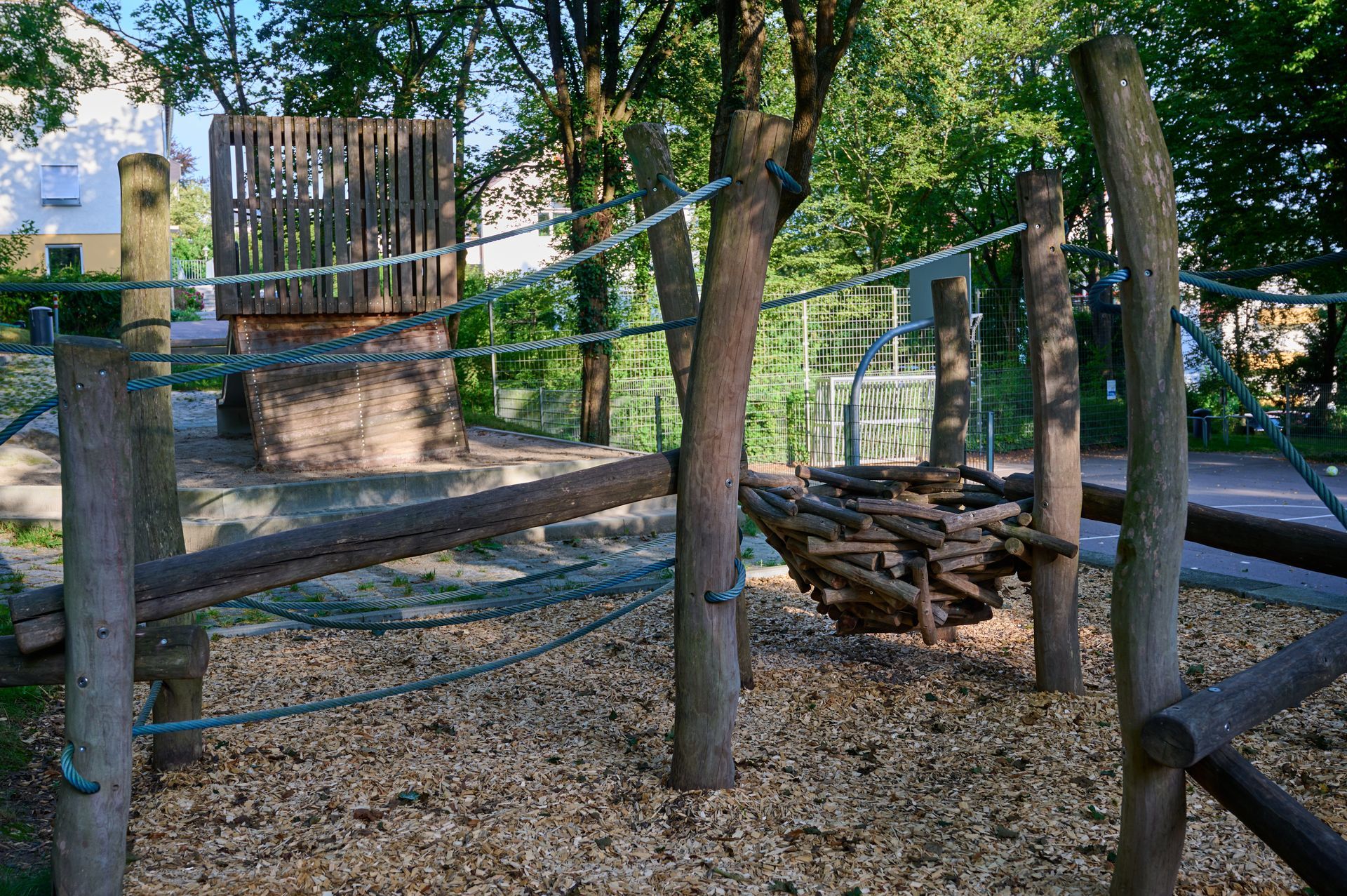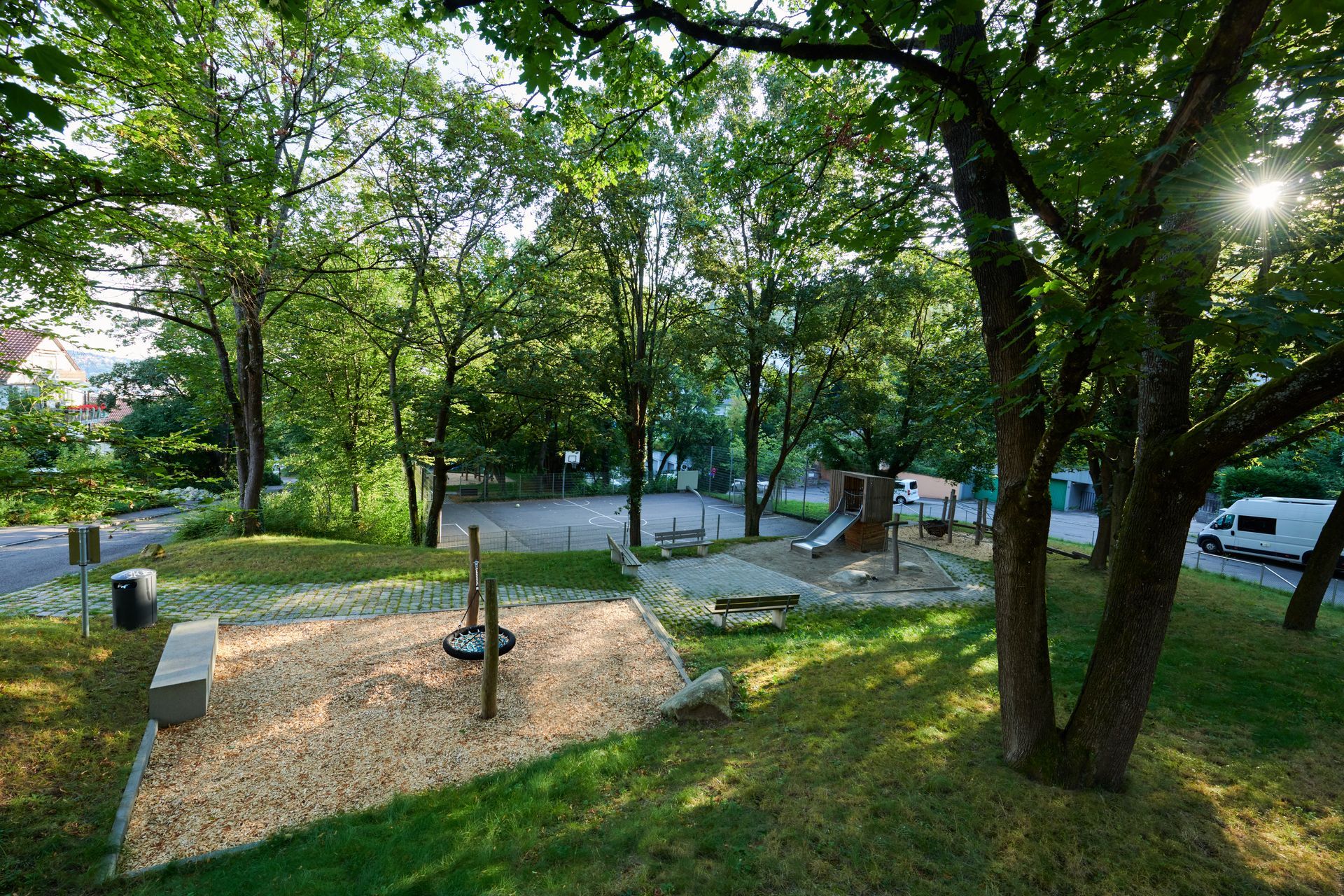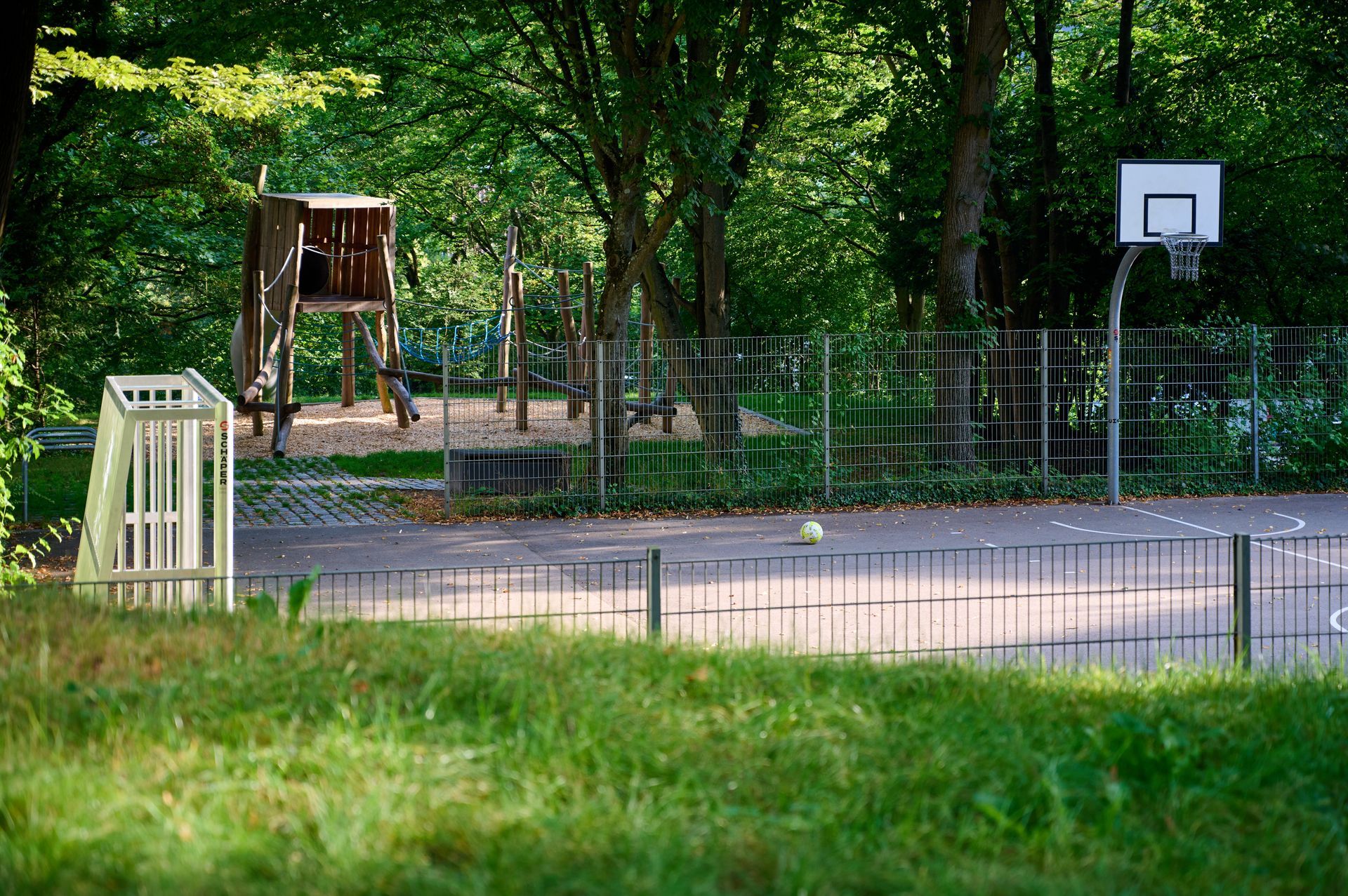 Der Spielplatz in der Immenhoferstraße wurde auf Basis einer Kinder- und Bürgerbeteiligung neu gestaltet. Entlang des Hanggeländes entstanden drei Spielterrassen für unterschiedliche Altersgruppen, ein Asphaltfeld für Ballsportarten sowie eine große Kletteranlage mit Tunnelrutsche, eingebettet in den bestehenden Baumbestand.
