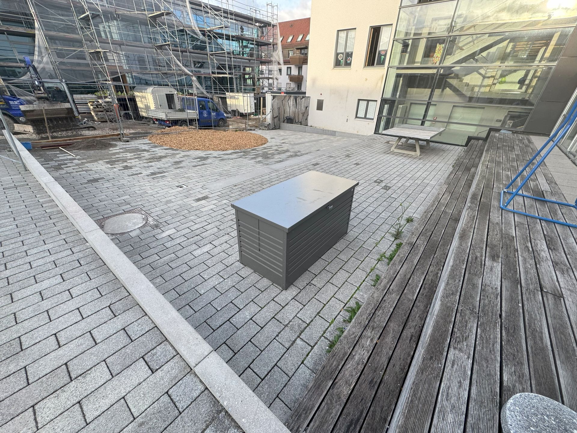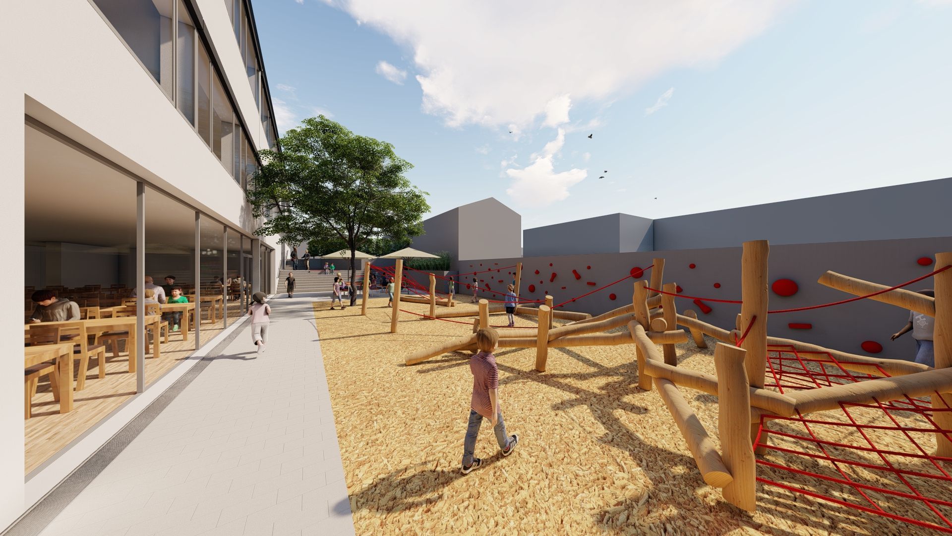 Der Schulhof der Zeppelinschule wird zu einem neuen, einladenden Freiraum für die Schüler. Zwischen den alten Gebäuden und dem Neubau entsteht Platz zum Verweilen und Spielen, rund um den Neubau wird die Umgebung neu gestaltet. Hinter den Bestandsgebäuden entsteht zudem ein moderner Spielbereich, der zum Toben, Entdecken und gemeinsamen Zusammensein einlädt.